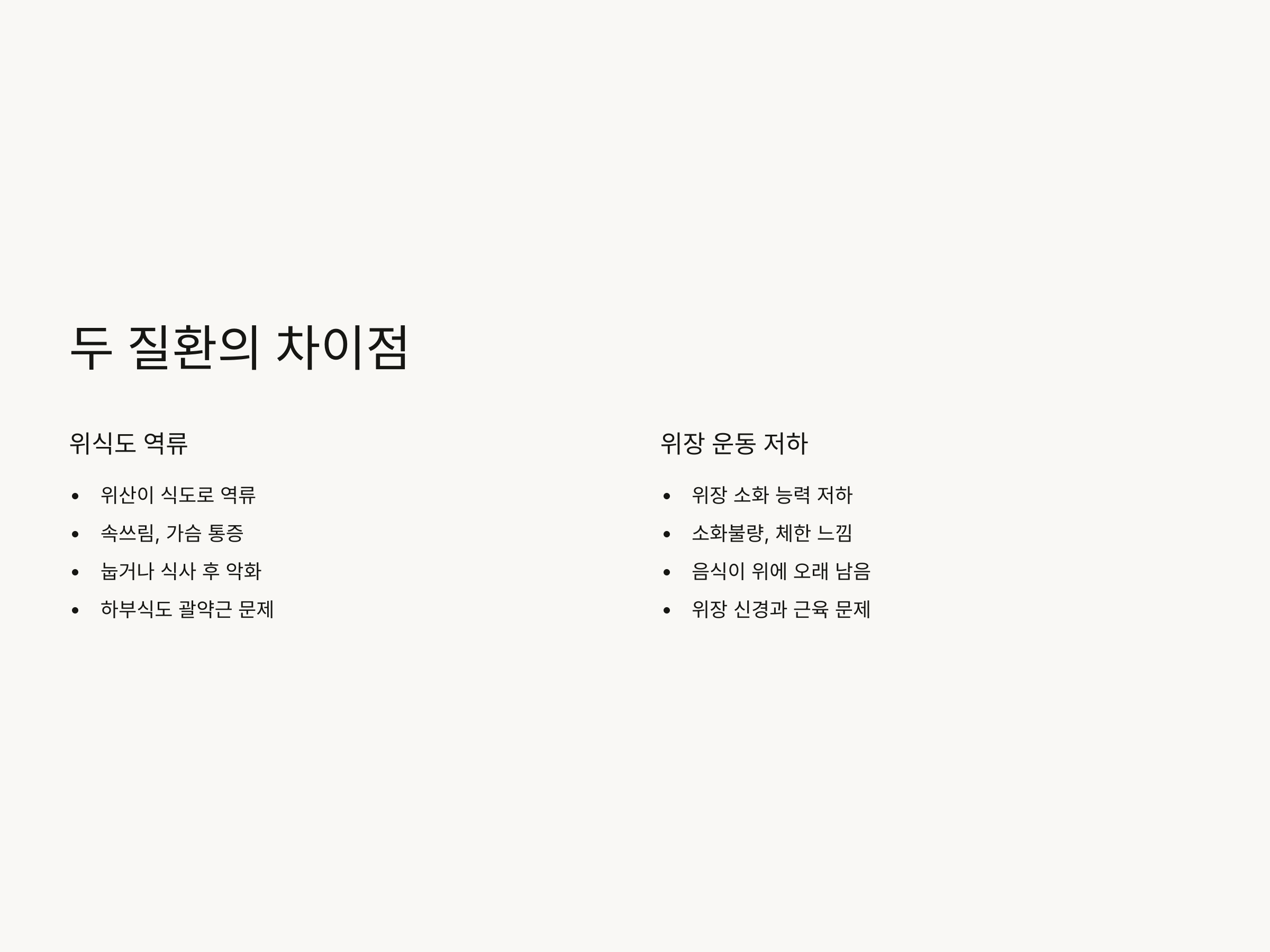 위식도 역류와 위장 운동 저하는 비슷한 증상을 유발할 수 있지만, 원인과 증상이 다릅니다. 위식도 역류는 위산이 식도로 역류하면서 발생하는 질환으로, 가슴 속에서 타는 듯한 느낌이 주된 증상입니다. 반면, 위장 운동 저하는 위장의 소화 능력이 떨어져 음식이 위장에서 오래 머무르게 되며, 주로 소화불량, 체한 느낌, 트림 등이 주 증상입니다.