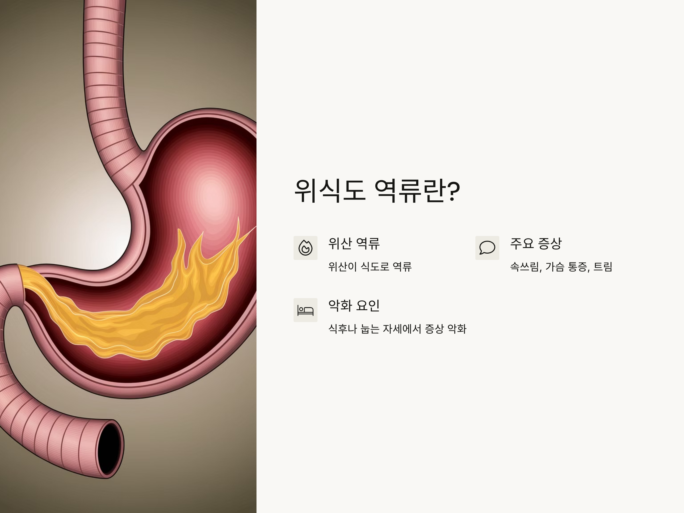 위식도 역류는 위장에서 위산이나 음식물이 식도로 역류하는 질환을 의미합니다. 이로 인해 가슴 속에 타는 듯한 느낌, 즉 속쓰림이 발생할 수 있으며, 트림도 자주 나오게 됩니다. 특히 식후나 눕는 자세에서 이러한 증상이 악화되는 경우가 많습니다. 위식도 역류는 식도와 위를 연결하는 하부식도 괄약근이 제대로 기능하지 않거나 이완되어 발생할 수 있습니다.