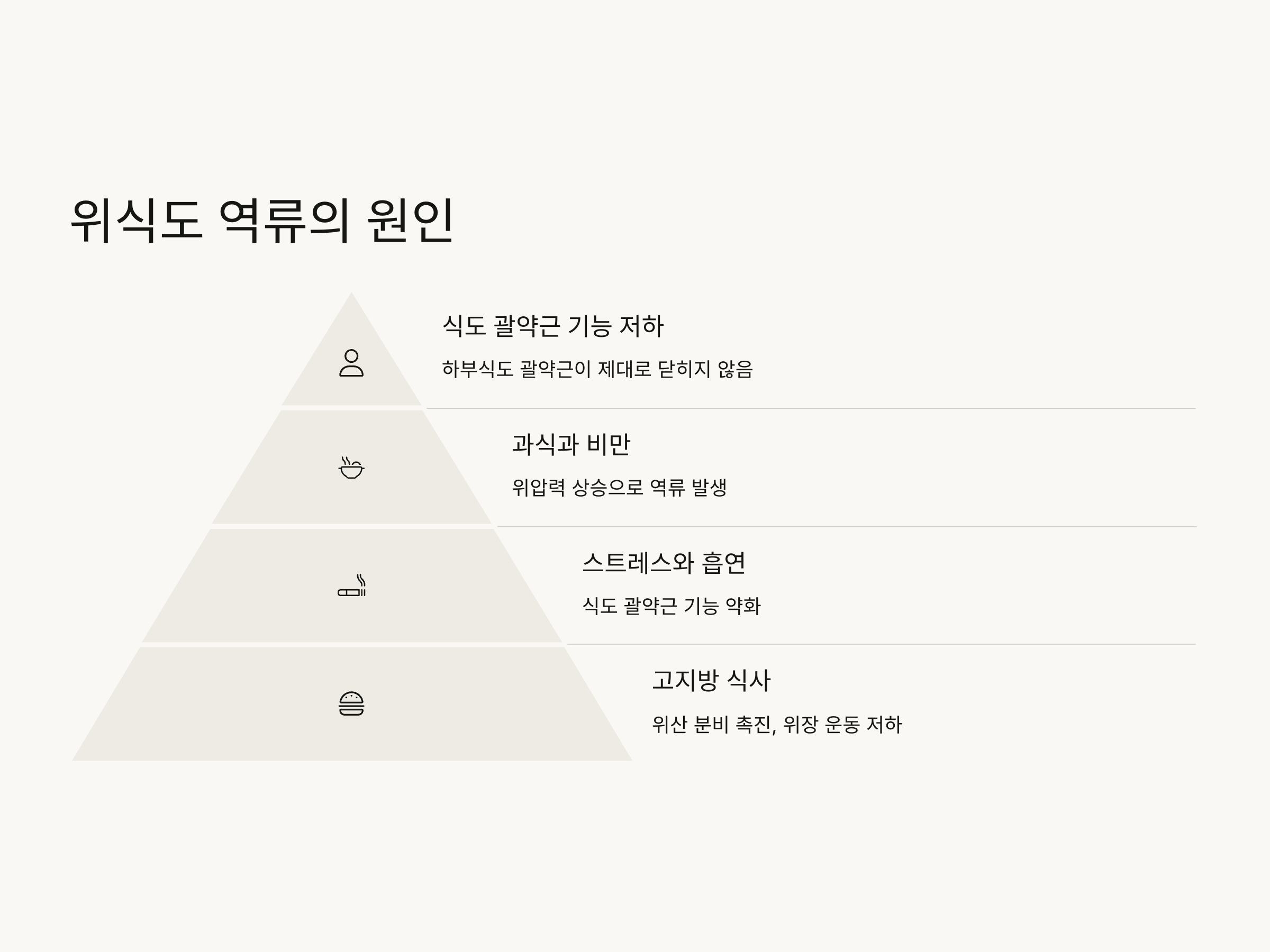 - 식도 괄약근의 기능 저하: 하부식도 괄약근이 제대로 닫히지 않아 위산이 식도로 역류합니다.