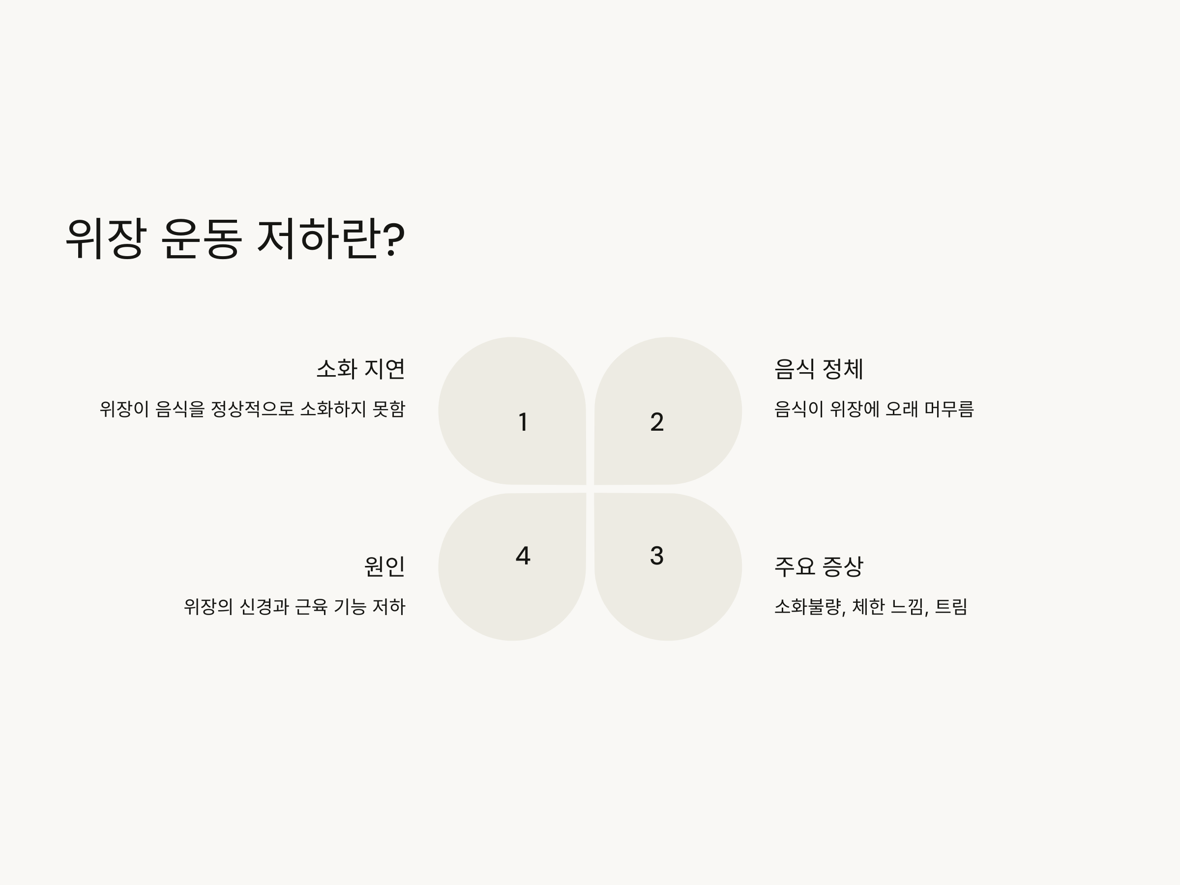위장 운동 저하는 위장이 정상적으로 음식을 소화하지 못하고, 소화가 지연되는 상태를 말합니다. 이 상태에서는 음식이 위장에서 오래 머무르면서 소화 불량, 트림, 체한 느낌 등을 유발할 수 있습니다. 위장이 정상적으로 음식을 이동시키지 못해 체하거나 불쾌한 증상을 경험하게 됩니다.