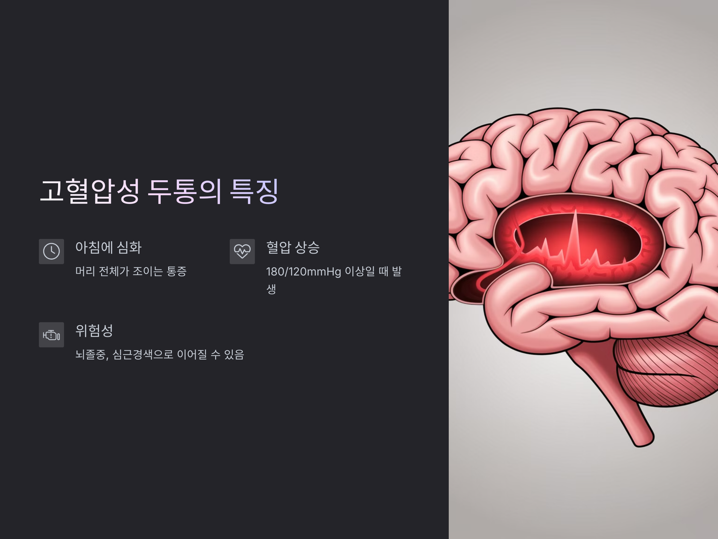 고혈압성 두통은 보통 아침에 심하게 느껴지며, 특히 혈압이 180/120mmHg 이상으로 급격하게 상승했을 때 두통이 동반되는 경우가 많습니다. 이는 뇌혈관이 과도한 압력을 받으면서 신경이 자극되는 과정에서 발생합니다. 일반적으로 머리 전체가 조이듯이 아프고, 머리를 움직이거나 아침에 일어나자마자 더 심하게 느껴지는 것이 특징입니다.