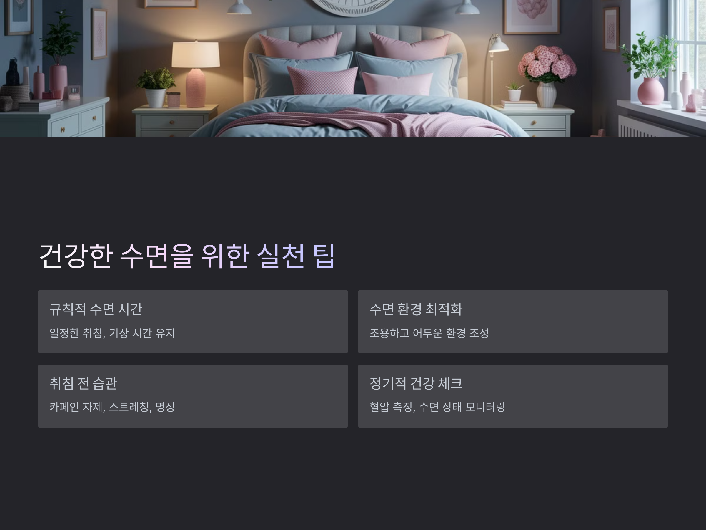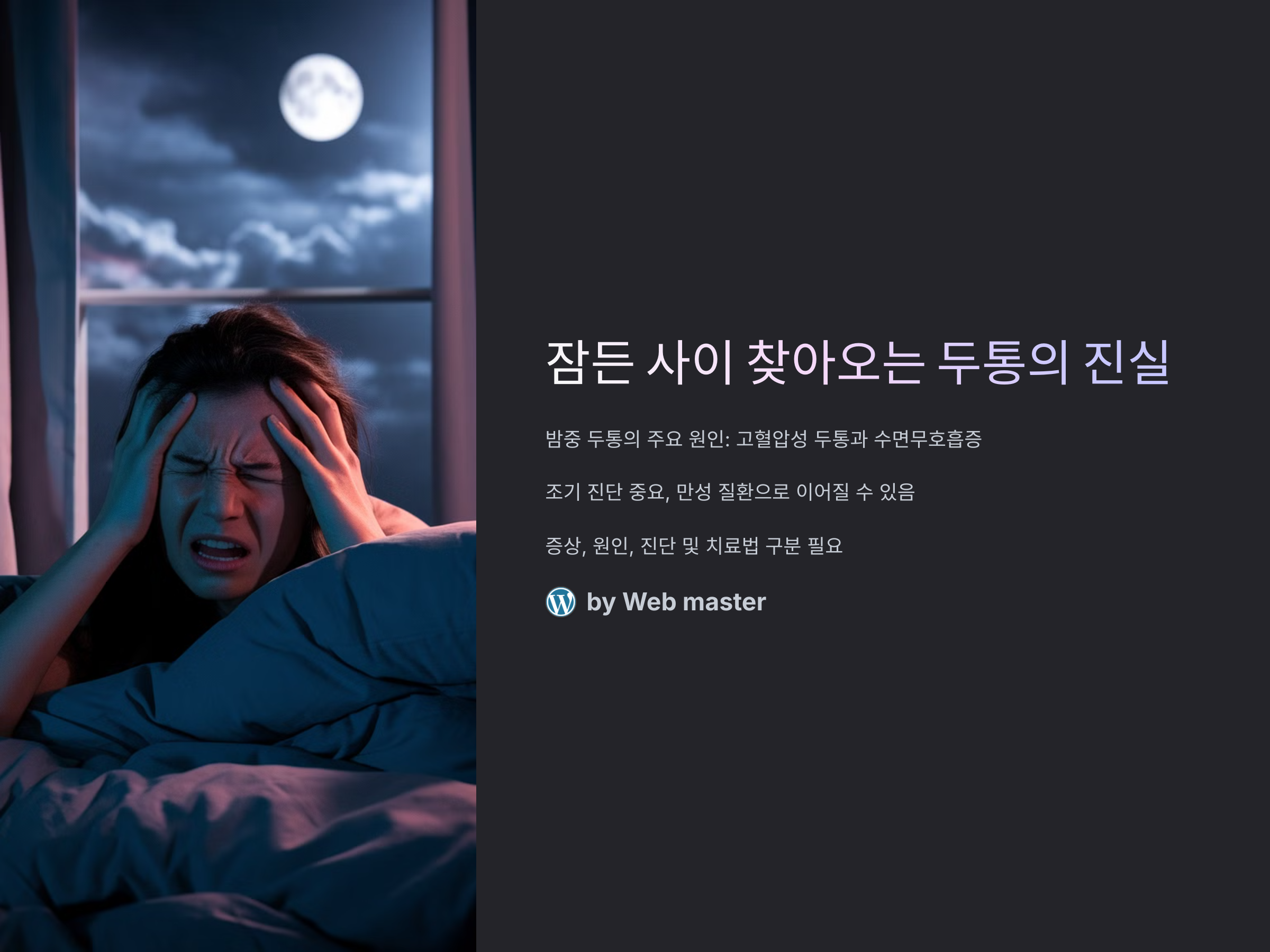 평화로운 밤, 잠결에 느껴지는 극심한 두통으로 인해 갑자기 잠에서 깬 경험이 있다면 단순한 수면 방해가 아니라 중요한 건강 신호일 수 있습니다. 최근 건강 커뮤니티와 의학 포럼에서 밤중 두통의 원인으로 '고혈압성 두통'과 '수면무호흡증'이 주요하게 언급되고 있습니다. 특히 수면무호흡증은 본인이 인지하지 못한 채 만성 질환으로 이어질 수 있어 조기 진단이 중요하며, 고혈압성 두통 역시 조절되지 않는 혈압이 심각한 합병증을 유발할 수 있어 경각심을 가져야 합니다. 이에 따라 두 질환의 주요 증상과 원인, 진단 및 치료법을 정확히 구분하고 적절한 대처를 하는 것이 중요합니다. 본 포스팅에서는 밤에 자다가 두통이 심해서 깼을 때, 그 원인이 무엇인지 판단할 수 있도록 최신 의학 정보와 함께 알기 쉽게 정리했습니다. 이를 통해 수면의 질을 높이고 더 건강한 생활을 영위하는 방법까지 함께 제시합니다.