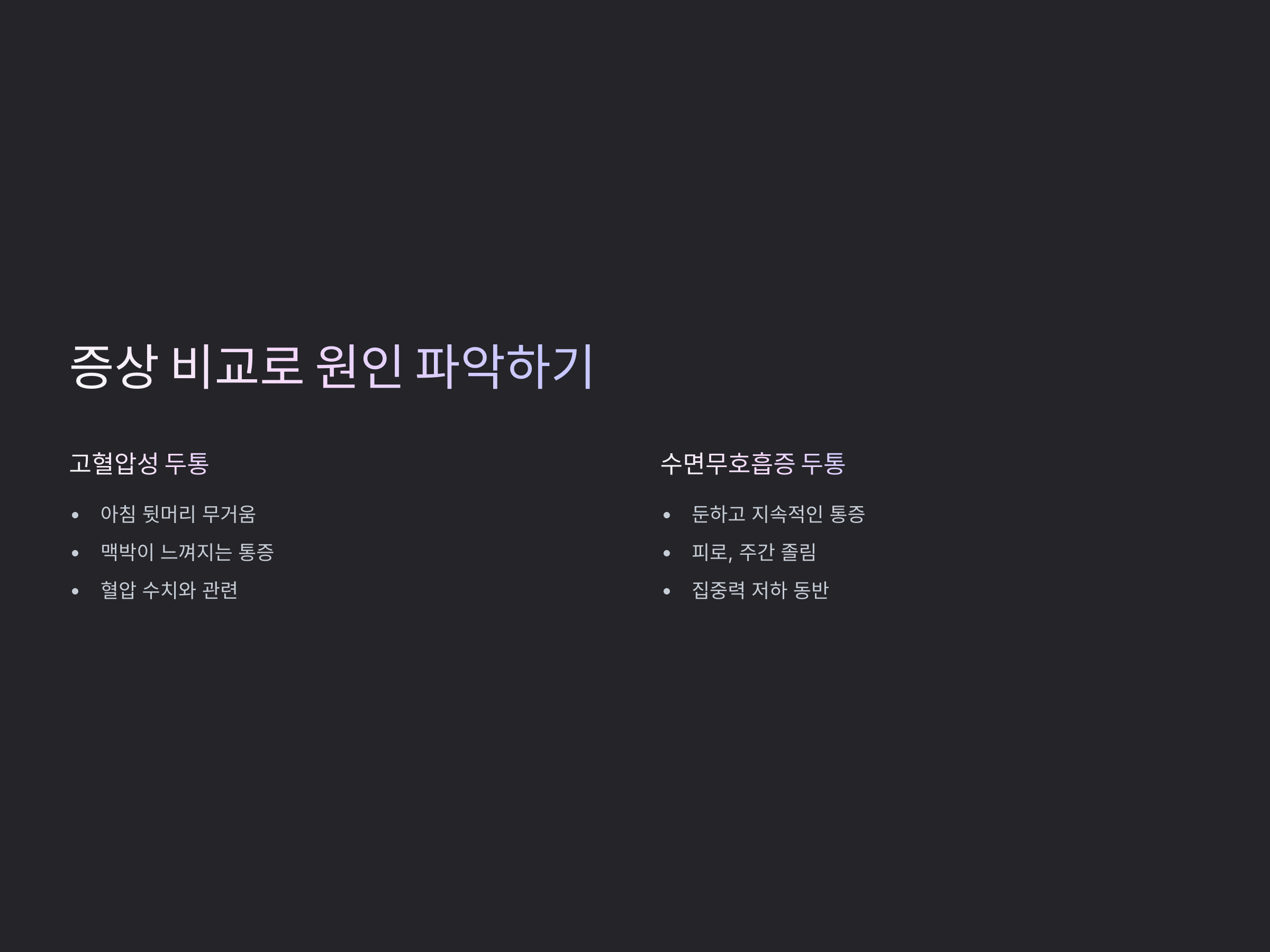 두통의 유형만으로는 정확한 원인을 파악하기 어렵지만, 함께 동반되는 증상을 통해 원인을 가늠할 수 있습니다. 고혈압성 두통은 보통 아침에 일어나면서 뒷머리가 무겁고 맥박이 느껴지는 통증이며, 고혈압 수치와 관련이 깊습니다. 반면 수면무호흡증으로 인한 두통은 둔하고 지속적인 통증과 함께 피로, 주간 졸림, 집중력 저하 등을 동반합니다.