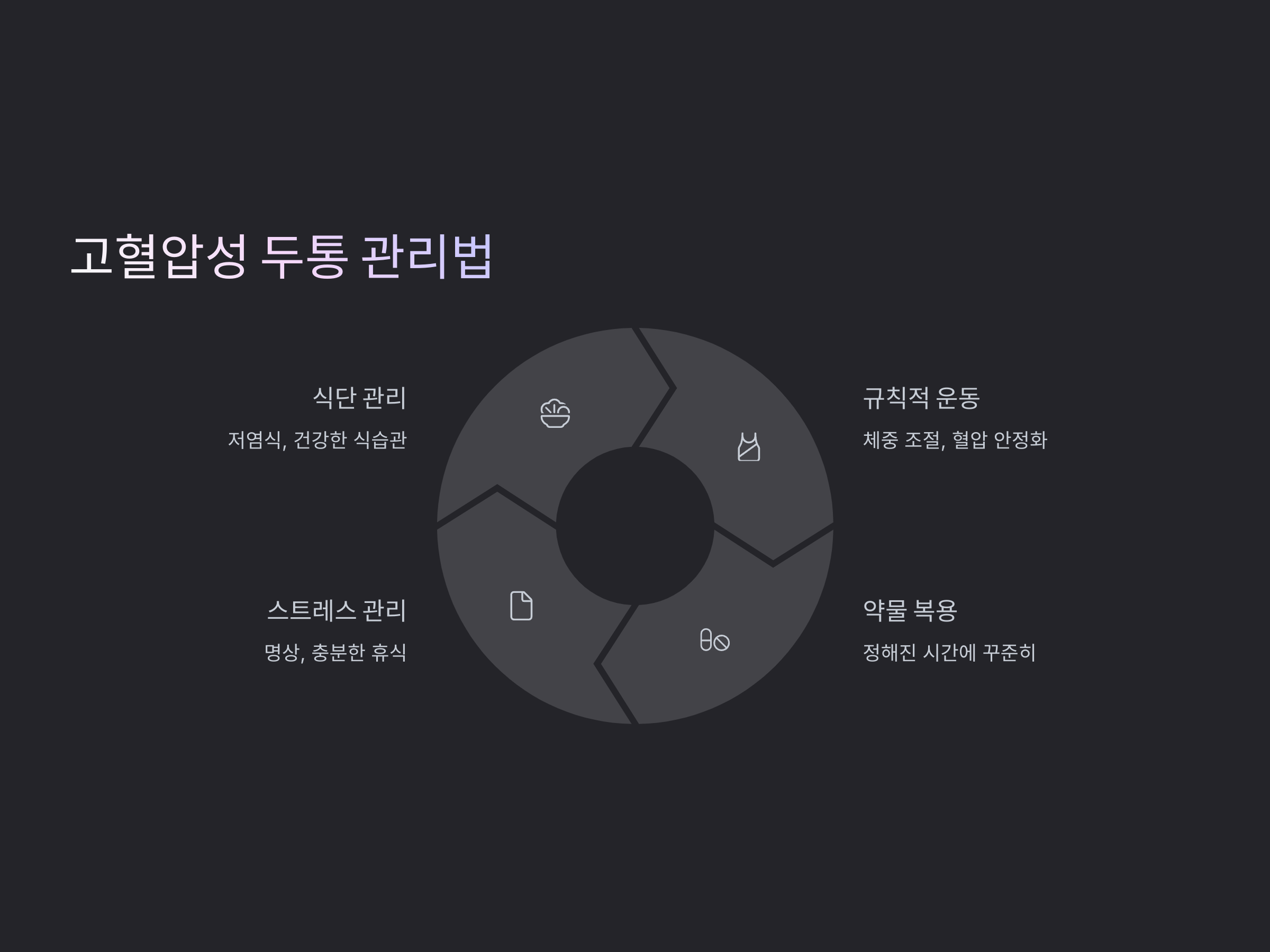 특히 저염식 식단, 금주, 금연은 혈압 조절에 큰 영향을 미치며, 이와 함께 수면의 질을 높이는 것도 두통 완화에 도움이 됩니다. 필요 시 의사의 상담을 통해 약물 조정 및 추가 치료를 고려하는 것이 좋습니다.
