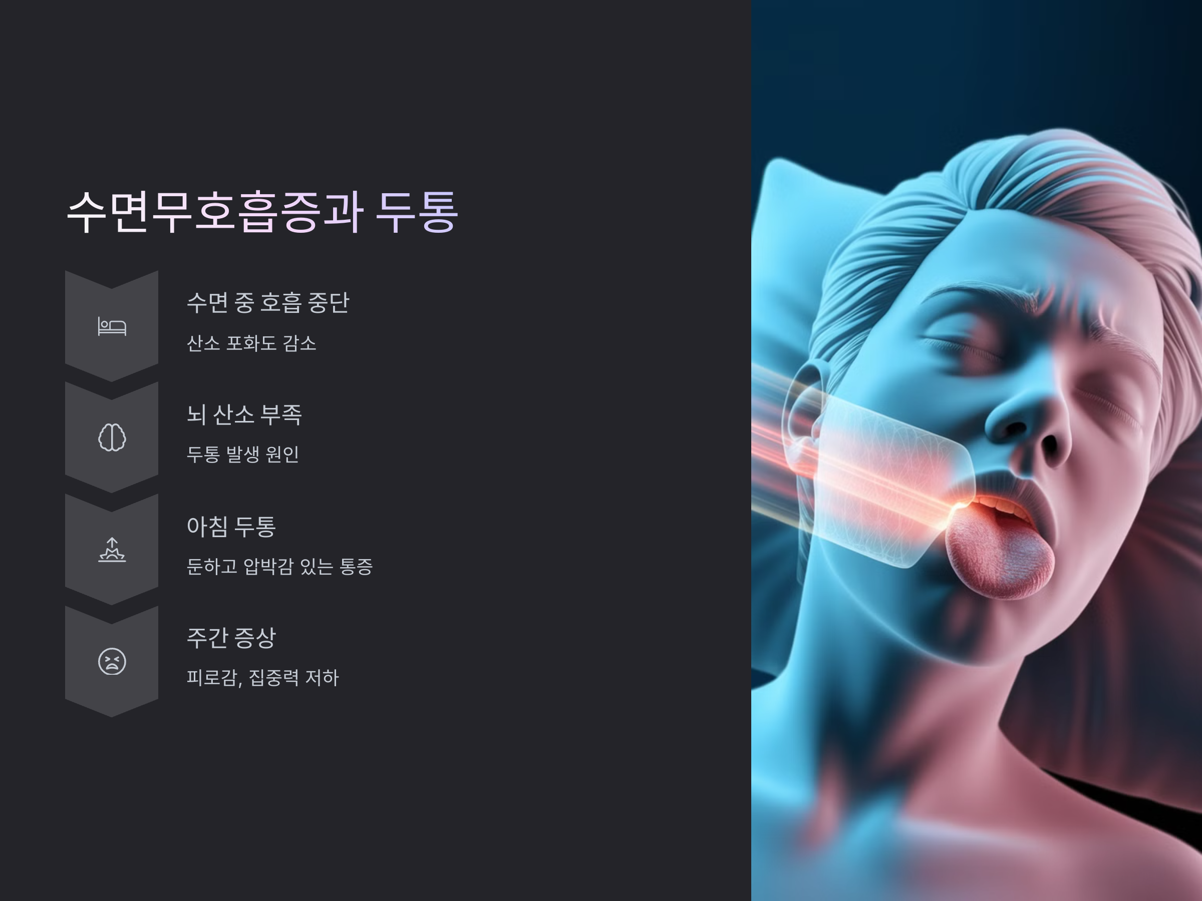 수면무호흡증은 수면 중 반복적으로 호흡이 멈추거나 얕아지는 현상으로, 수면 중 산소 포화도가 떨어지면서 뇌에 적절한 산소 공급이 어려워집니다. 그 결과로 두통이 발생하며, 이는 주로 새벽이나 아침 기상 직후에 집중되어 나타납니다. 특히 수면무호흡증 환자의 두통은 둔하고 압박감 있는 형태로 지속되며, 낮 시간 집중력 저하와 함께 나타나기도 합니다.