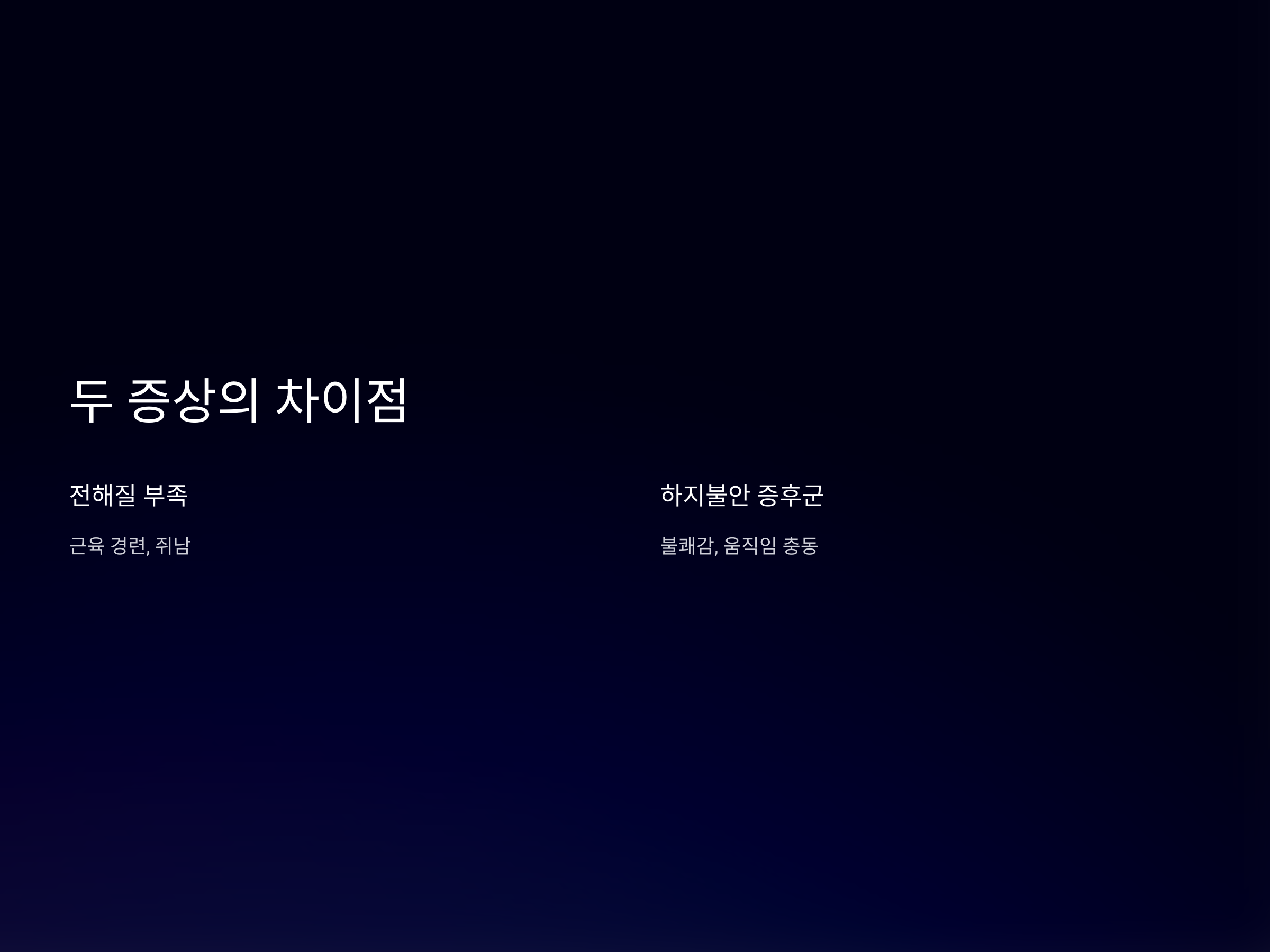 전해질 부족과 하지불안 증후군은 모두 다리에서 불편함을 유발하지만, 그 원인과 증상의 양상에서 차이를 보입니다. 전해질 부족은 주로 근육의 경련이나 쥐가 나는 증상으로 나타나며, 주로 과도한 운동이나 수분 부족과 관련이 있습니다. 반면, 하지불안 증후군은 다리의 불쾌한 느낌과 이를 해소하기 위한 충동이 특징으로, 밤에 더 심해지고 다리를 움직이면 완화되는 경향이 있습니다.
