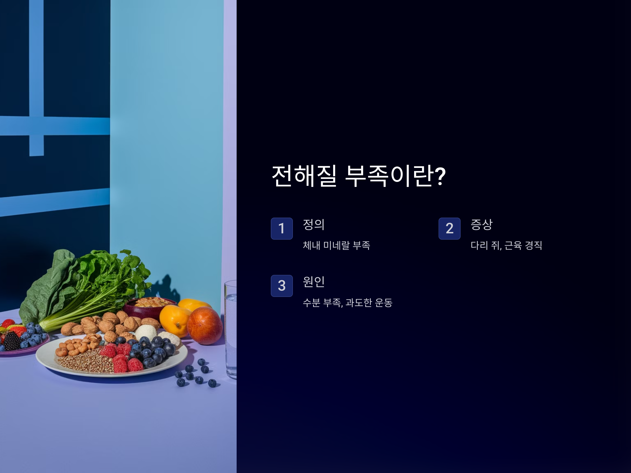 전해질은 체내에서 중요한 역할을 하는 미네랄로, 나트륨, 칼륨, 칼슘, 마그네슘 등이 포함됩니다. 이들 전해질은 근육의 수축과 이완을 조절하는 데 중요한 역할을 하며, 이 부족이 다리에 쥐가 나는 주요 원인 중 하나입니다. 특히 칼륨과 마그네슘 부족은 근육 경련을 유발할 수 있습니다.