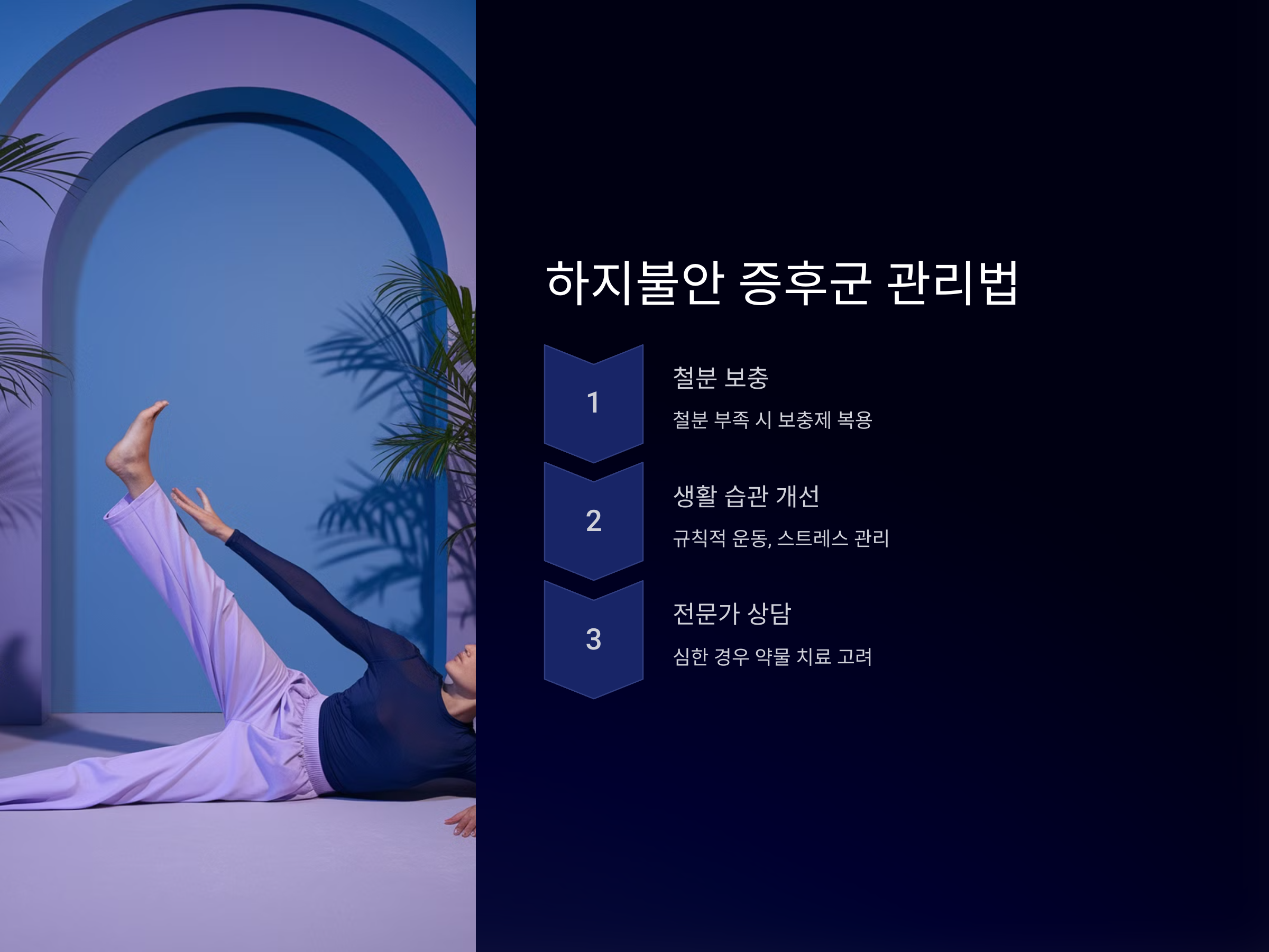 하지불안 증후군은 철분 보충, 규칙적인 운동, 스트레스 관리가 중요합니다. 증상이 심한 경우 약물 치료도 고려할 수 있습니다.