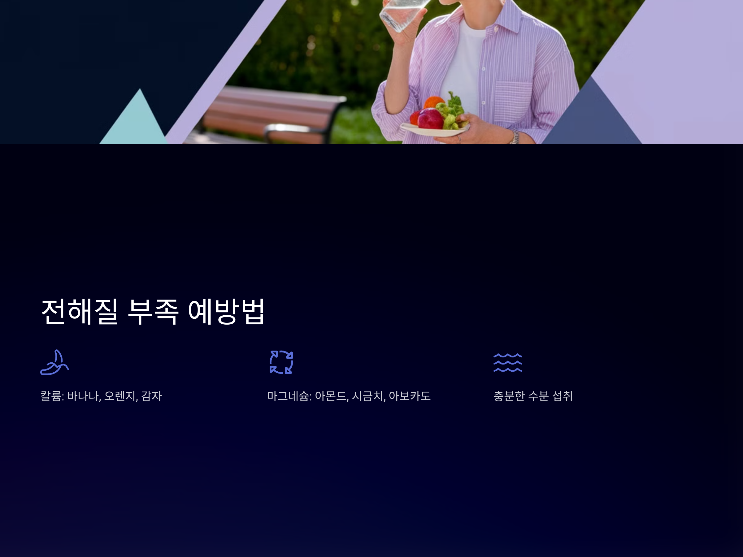 전해질 부족은 주로 수분 섭취 부족과 관련이 있습니다. 전해질이 풍부한 음식을 섭취하고, 물을 자주 마셔야 합니다. 칼륨, 마그네슘, 칼슘 등이 풍부한 음식을 섭취하는 것이 중요합니다.