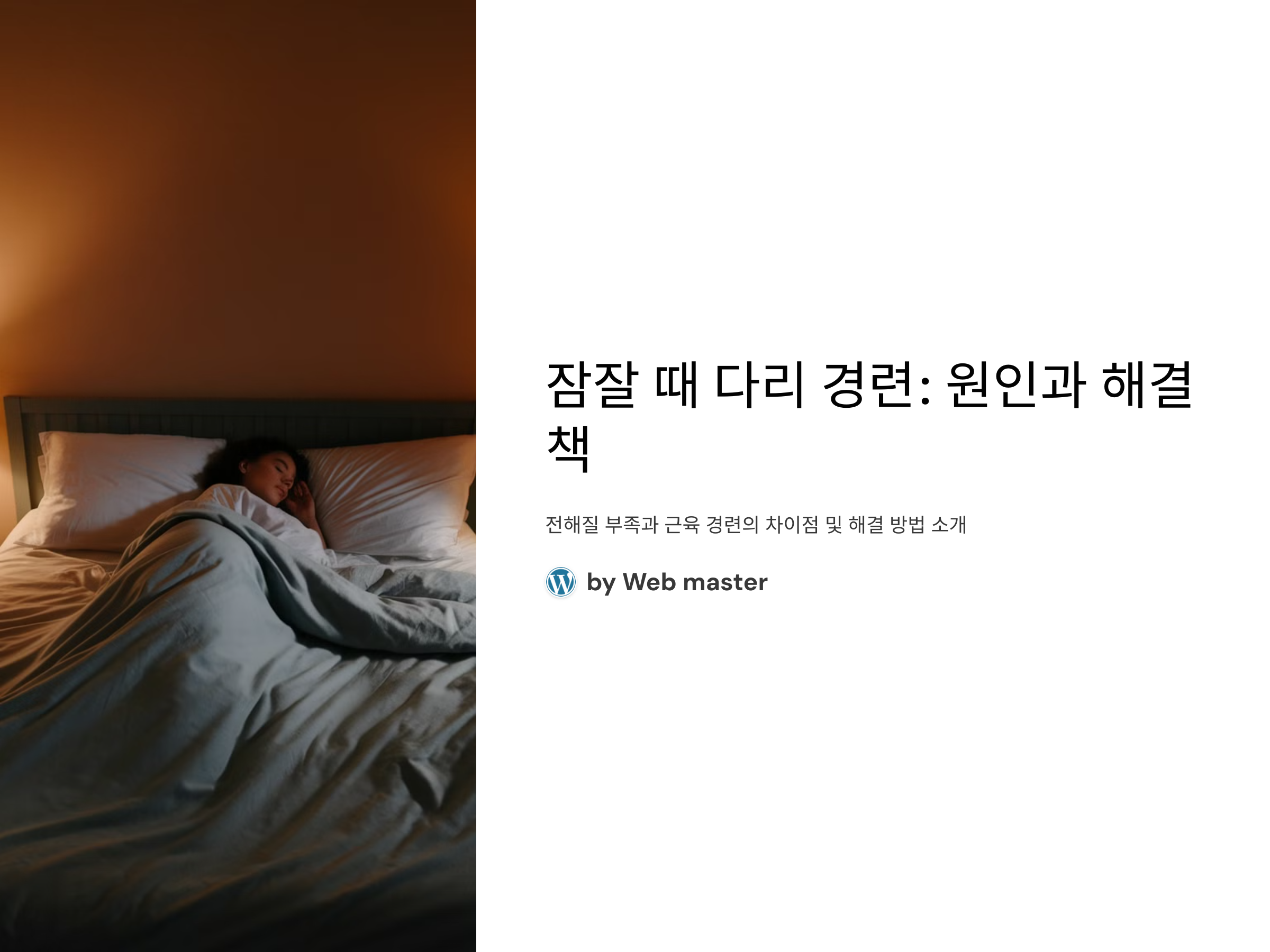 잠잘 때 다리 경련이 심하게 발생하면 매우 불편하고 고통스럽죠. 많은 사람들이 이런 증상을 겪으면서 "전해질 부족인가?", "근육 경련인가?"라는 고민을 하게 됩니다. 사실, 이 두 가지 원인은 비슷해 보이지만, 세부적인 차이가 있으며 각기 다른 대처법이 필요합니다. 그래서 오늘은 다리 경련의 주요 원인인 전해질 부족과 근육 경련에 대해 자세히 알아보고, 이들의 차이점과 해결책을 소개하려 합니다.