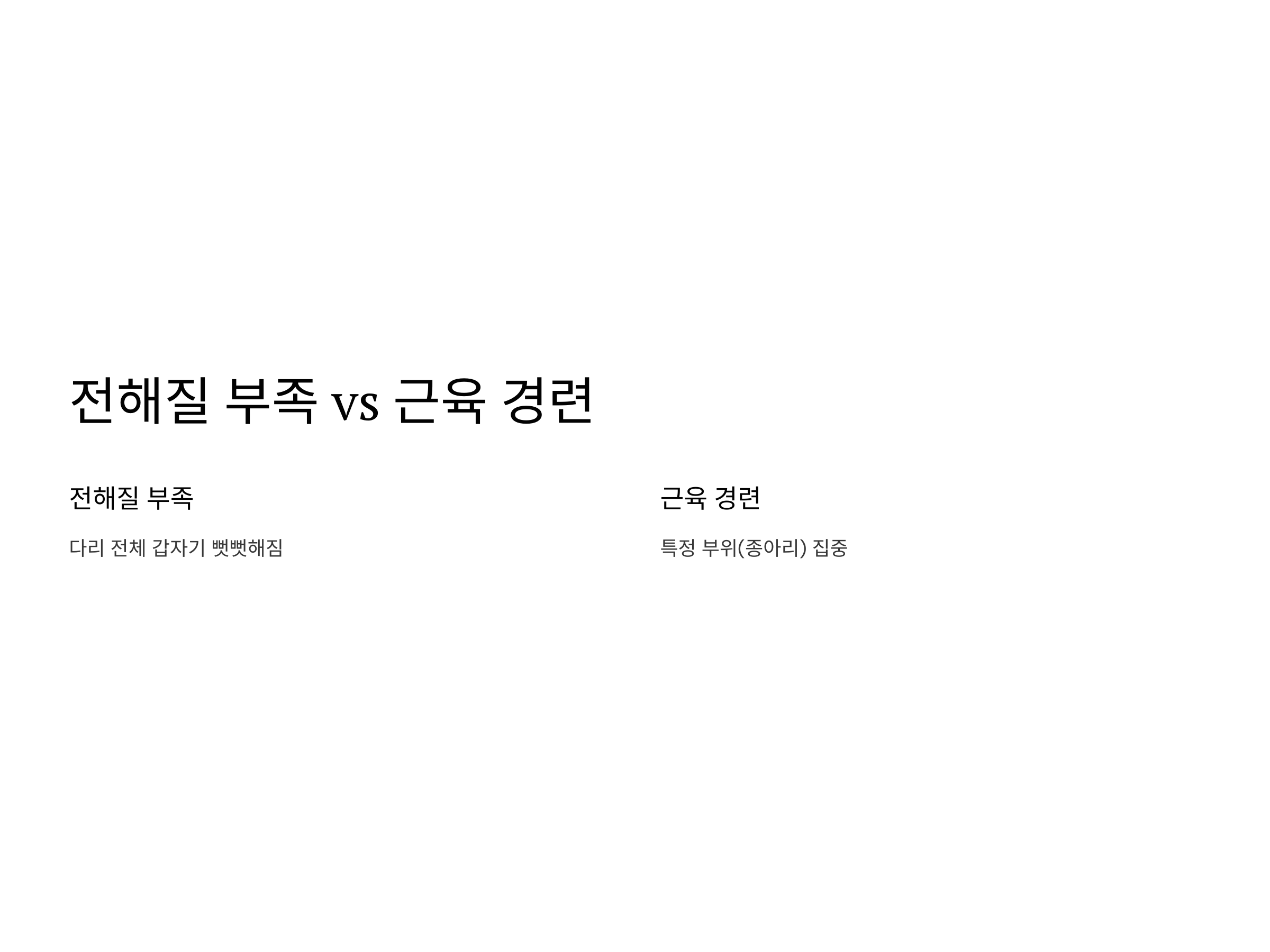- 근육 경련은 근육의 과도한 사용, 피로, 불편한 자세로 인해 근육이 갑자기 수축하는 현상입니다. 이 경우, 특정 부위(대개 종아리)에 경련이 집중됩니다.
