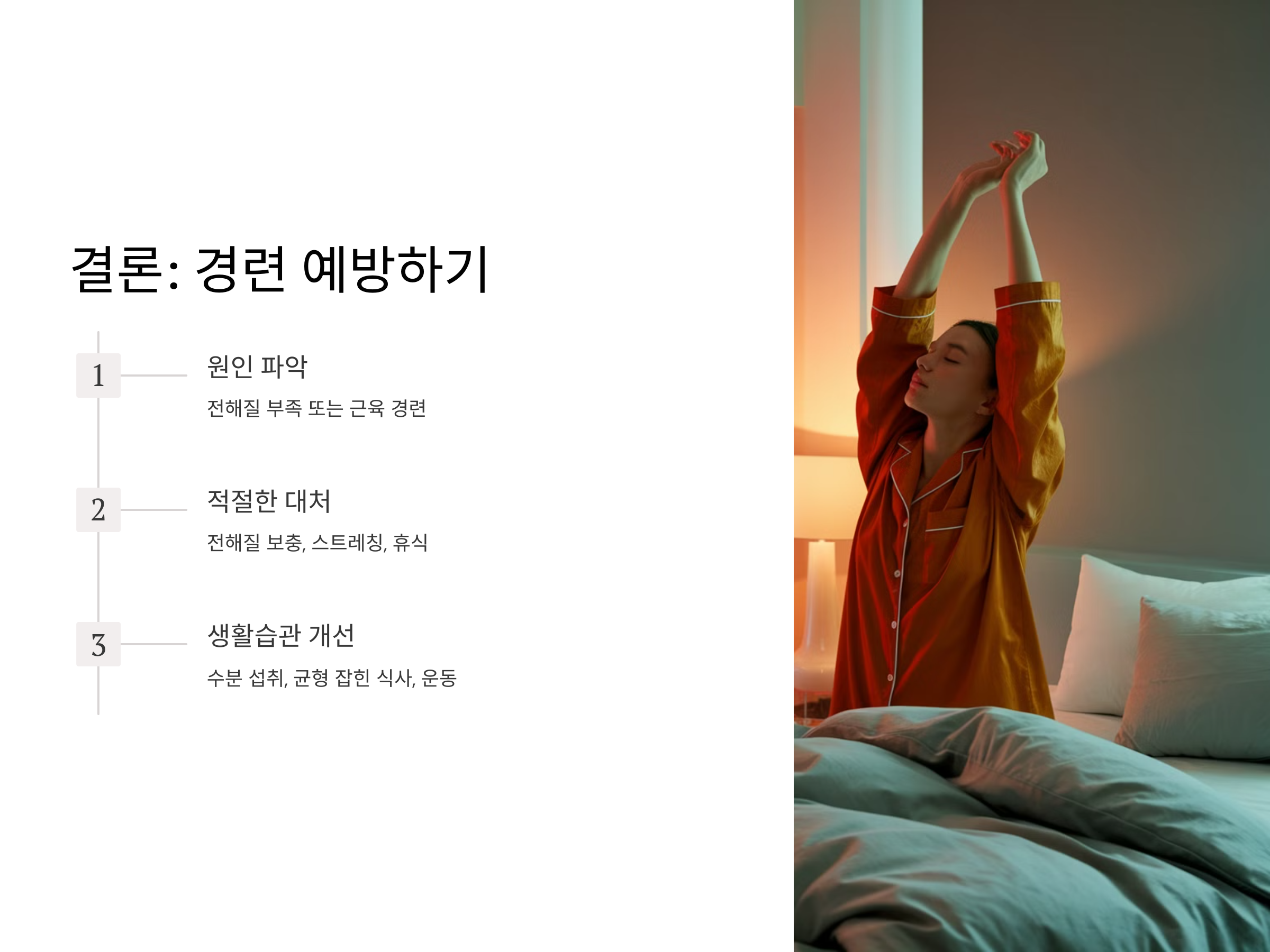 - 전해질 부족인 경우에는 전해질 보충이 필요하고, 근육 경련의 경우에는 스트레칭과 휴식이 중요합니다.