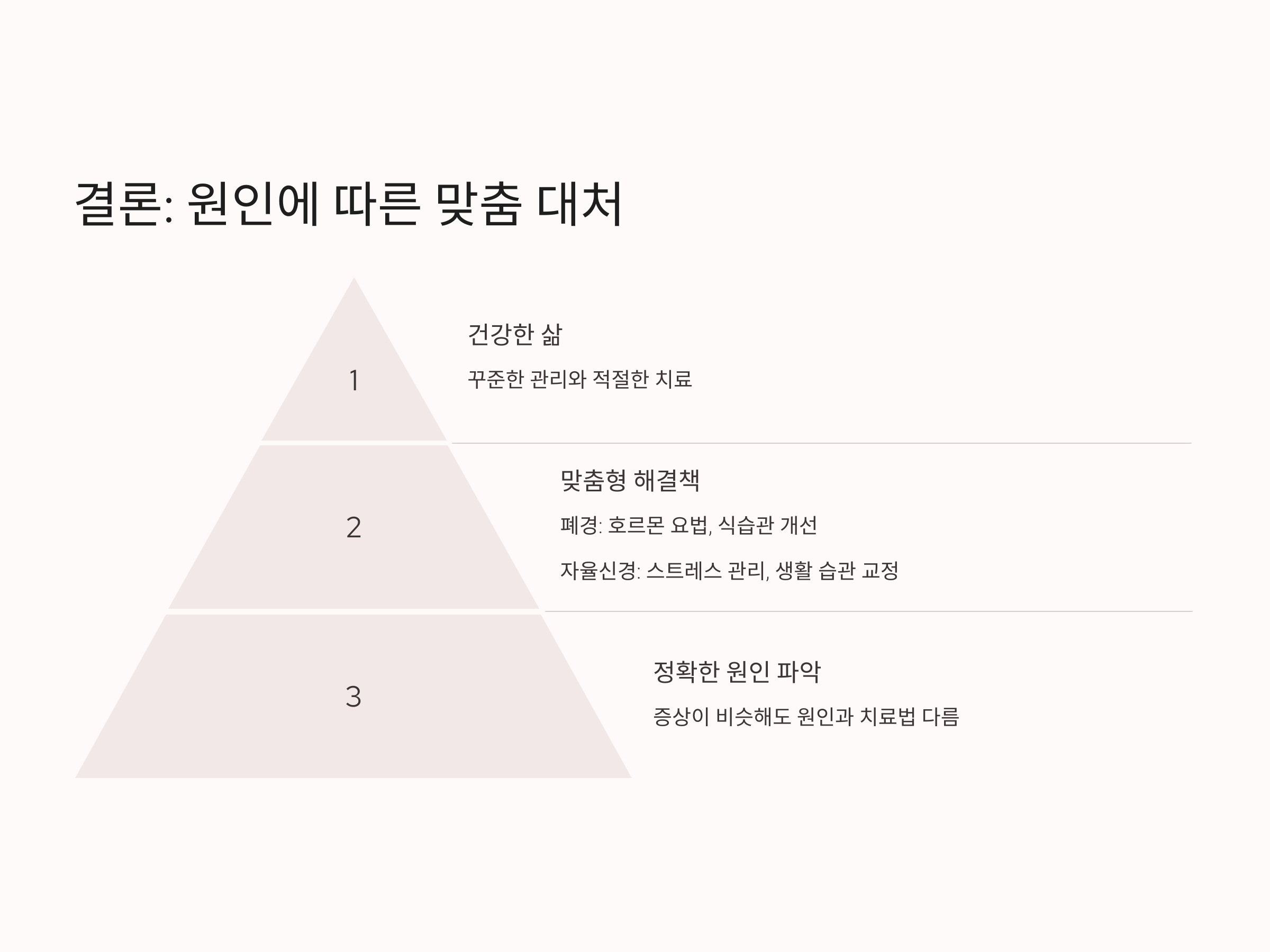 | 주요 원인 | 에스트로겐 감소 | 스트레스, 과로, 생활 습관 |