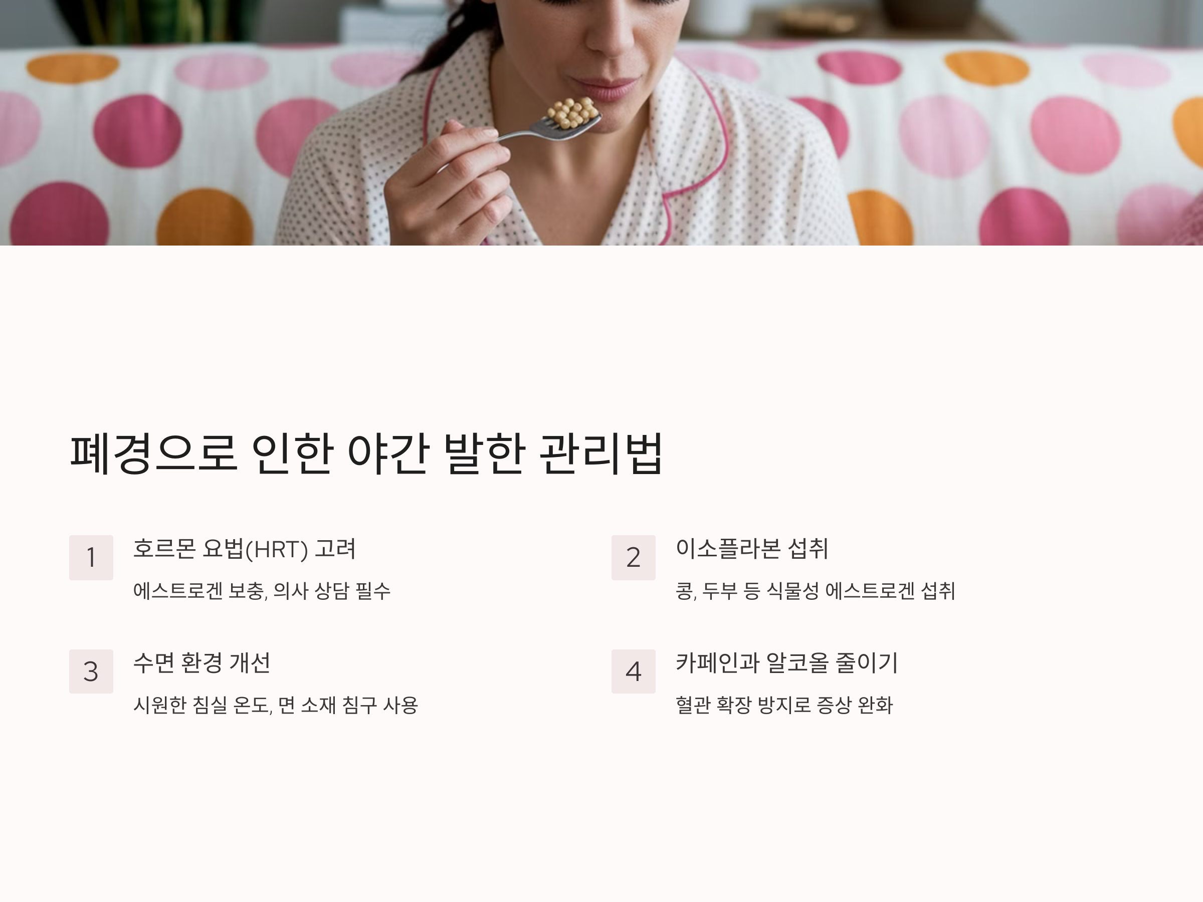 폐경으로 인한 야간 발한은 신체 내부의 호르몬 변화 때문에 발생하므로, 적절한 관리가 필요합니다. 특히 아래 방법을 실천하면 증상을 완화하는 데 도움이 될 수 있습니다.
