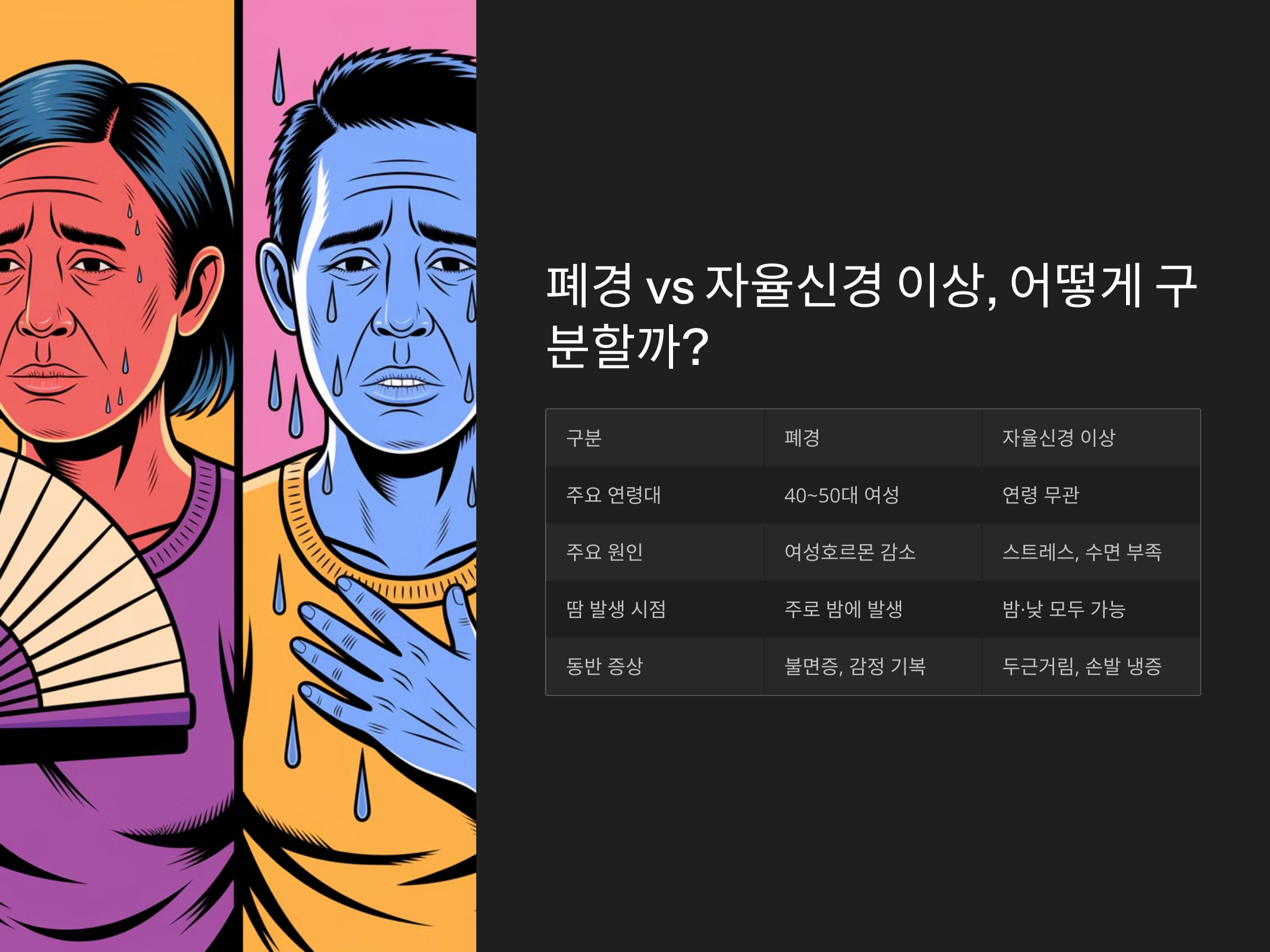 수면 중 화끈거림과 다한증은 폐경과 자율신경 이상 모두에서 발생할 수 있는 증상입니다.