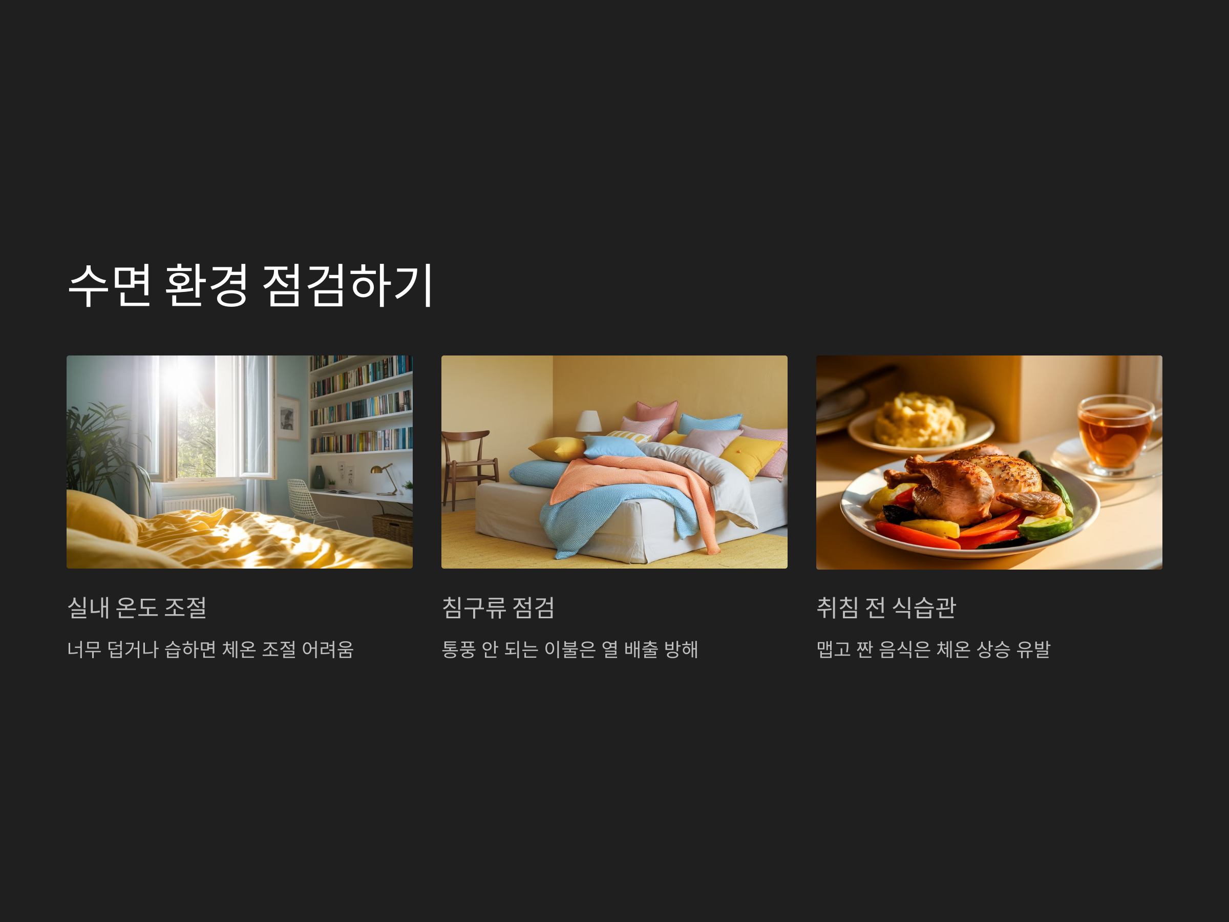 - 잠들기 전 음식 섭취: 맵고 짠 음식은 체온을 올릴 수 있음