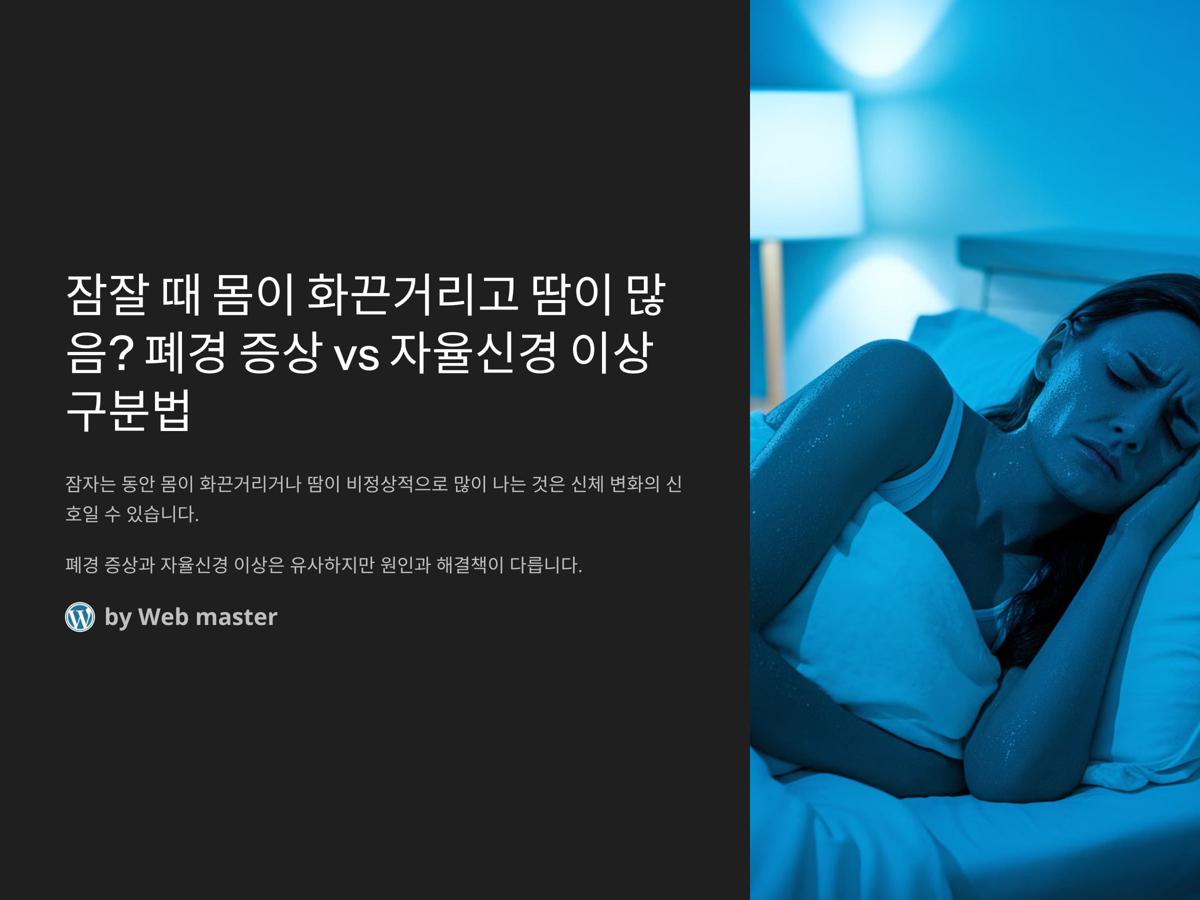 잠을 자는 동안 몸이 화끈거리거나 땀이 비정상적으로 많이 난다면, 이는 단순한 환경적 요인이 아니라 신체 변화의 신호일 수 있습니다. 특히 중년 여성이라면 폐경 증상을 의심할 수 있으며, 남녀를 불문하고 자율신경 이상으로 인해 나타날 수도 있습니다. 이 두 가지 원인은 증상이 유사해 혼동하기 쉽지만, 정확한 구분이 중요합니다. 이번 글에서는 폐경과 자율신경 이상으로 인한 증상의 차이를 상세히 분석하고, 각각의 원인과 해결책을 알아보겠습니다.