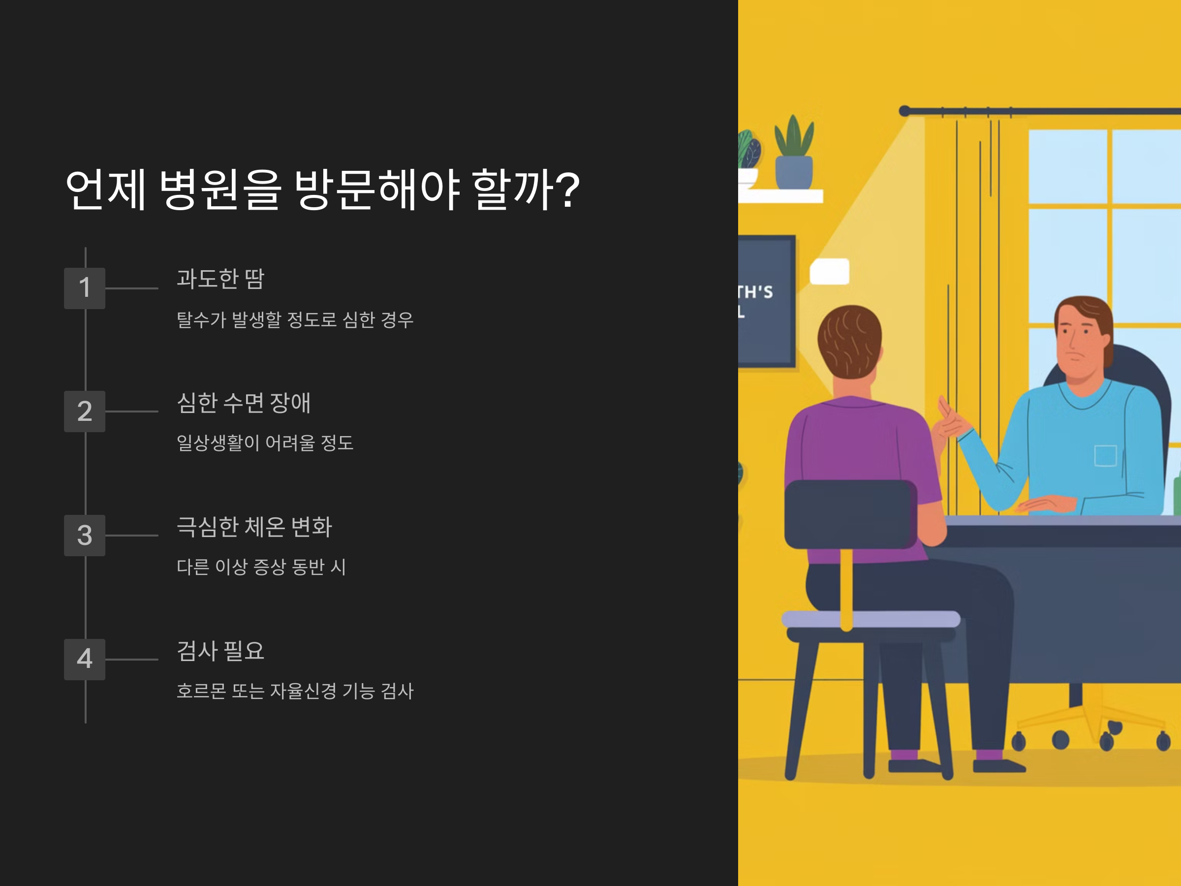 만약 40대 이상 여성이라면 폐경을 먼저 의심하고, 남성이나 젊은 여성이라면 자율신경 이상을 고려하는 것이 합리적입니다. 다만 정확한 진단을 위해선 전문의 상담이 필수적입니다.