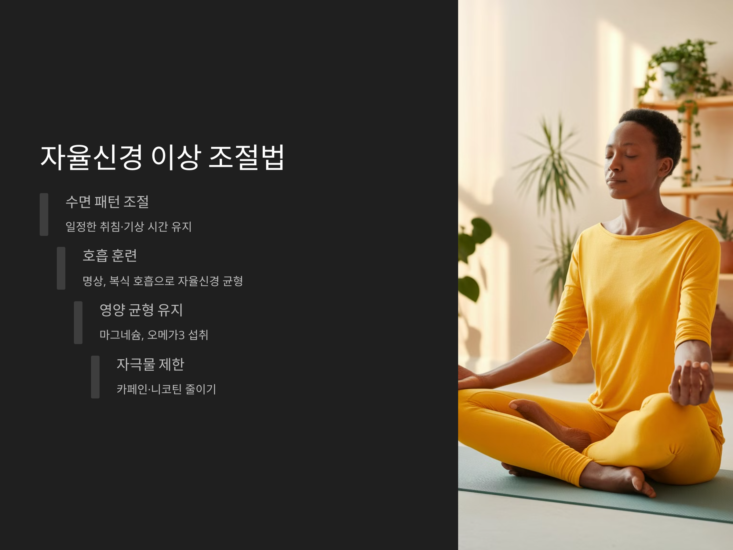 - 호흡 훈련: 명상, 복식 호흡으로 자율신경 균형 맞추기