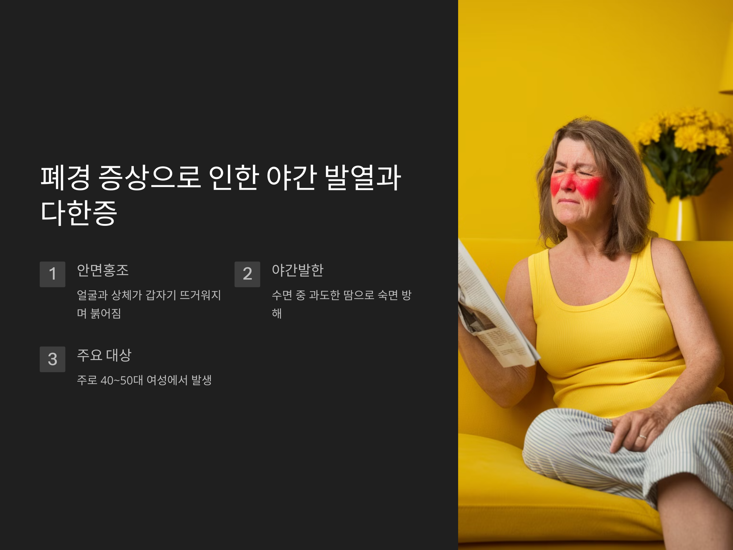 폐경은 여성의 생식 호르몬인 에스트로겐과 프로게스테론의 감소로 인해 다양한 신체 변화를 유발합니다. 특히 폐경기의 대표적인 증상 중 하나가 안면홍조와 야간발한입니다.