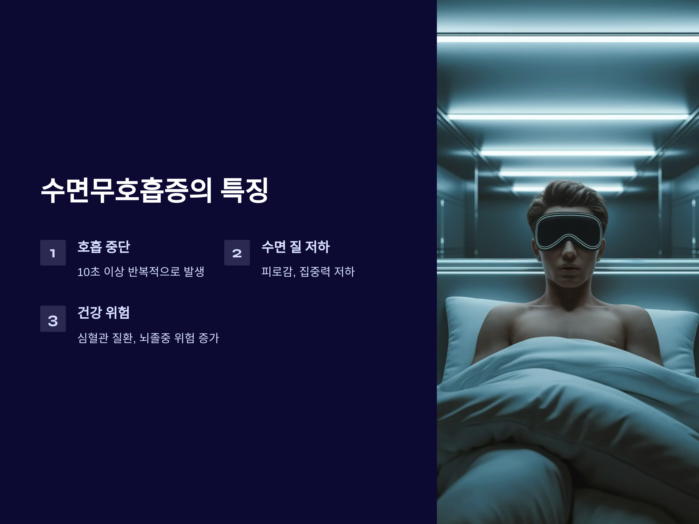 수면무호흡증은 수면 중 호흡이 일시적으로 멈추는 상태를 의미합니다. 이는 호흡이 10초 이상 멈추는 현상이 반복되어 나타나는 질환으로, 잠자는 동안 여러 번 호흡이 중단되기 때문에 수면의 질이 매우 떨어집니다. 이로 인해 피로감이나 집중력 저하가 일어나고, 심한 경우에는 심혈관 질환이나 뇌졸중의 위험도 증가할 수 있습니다.