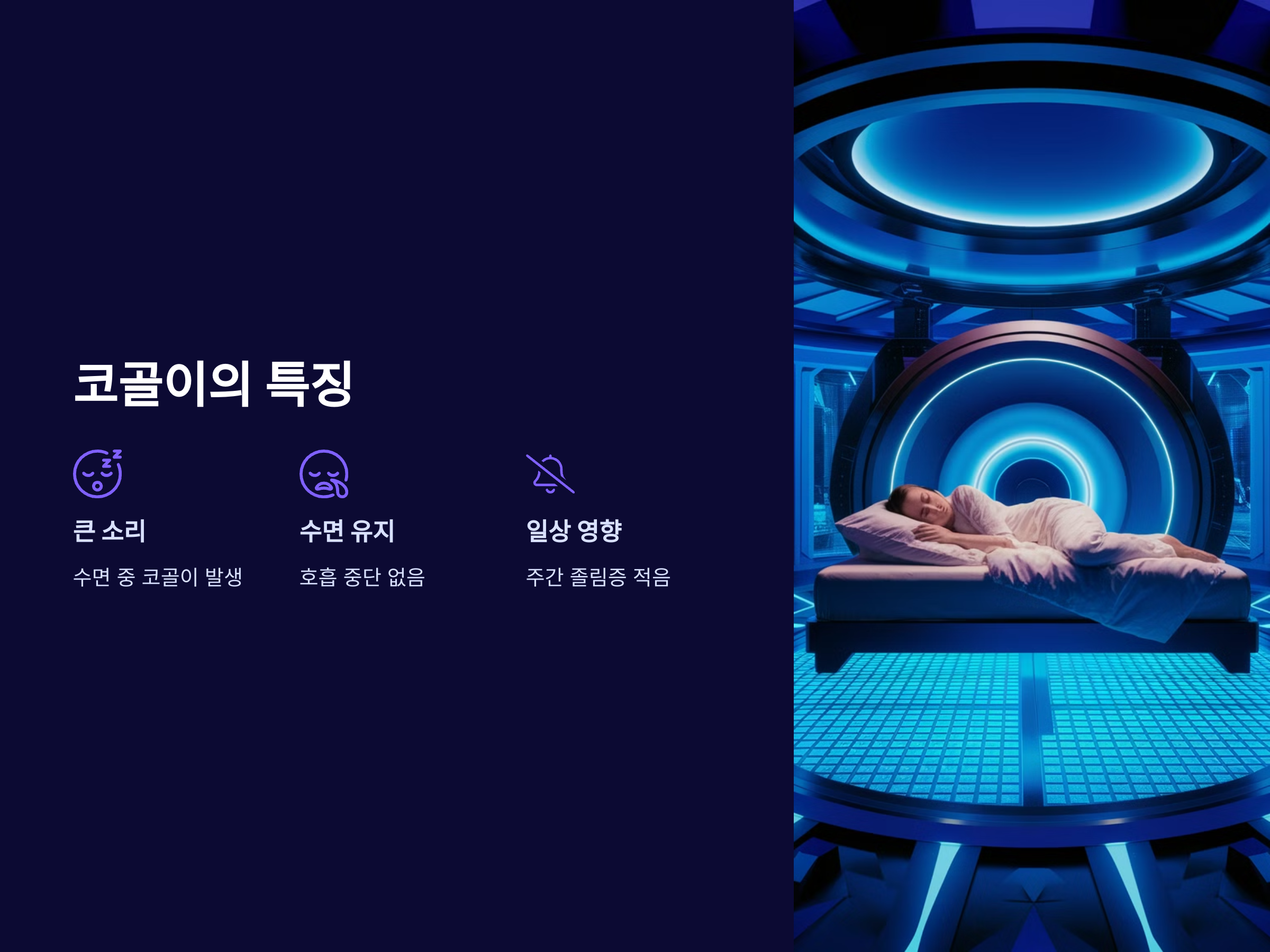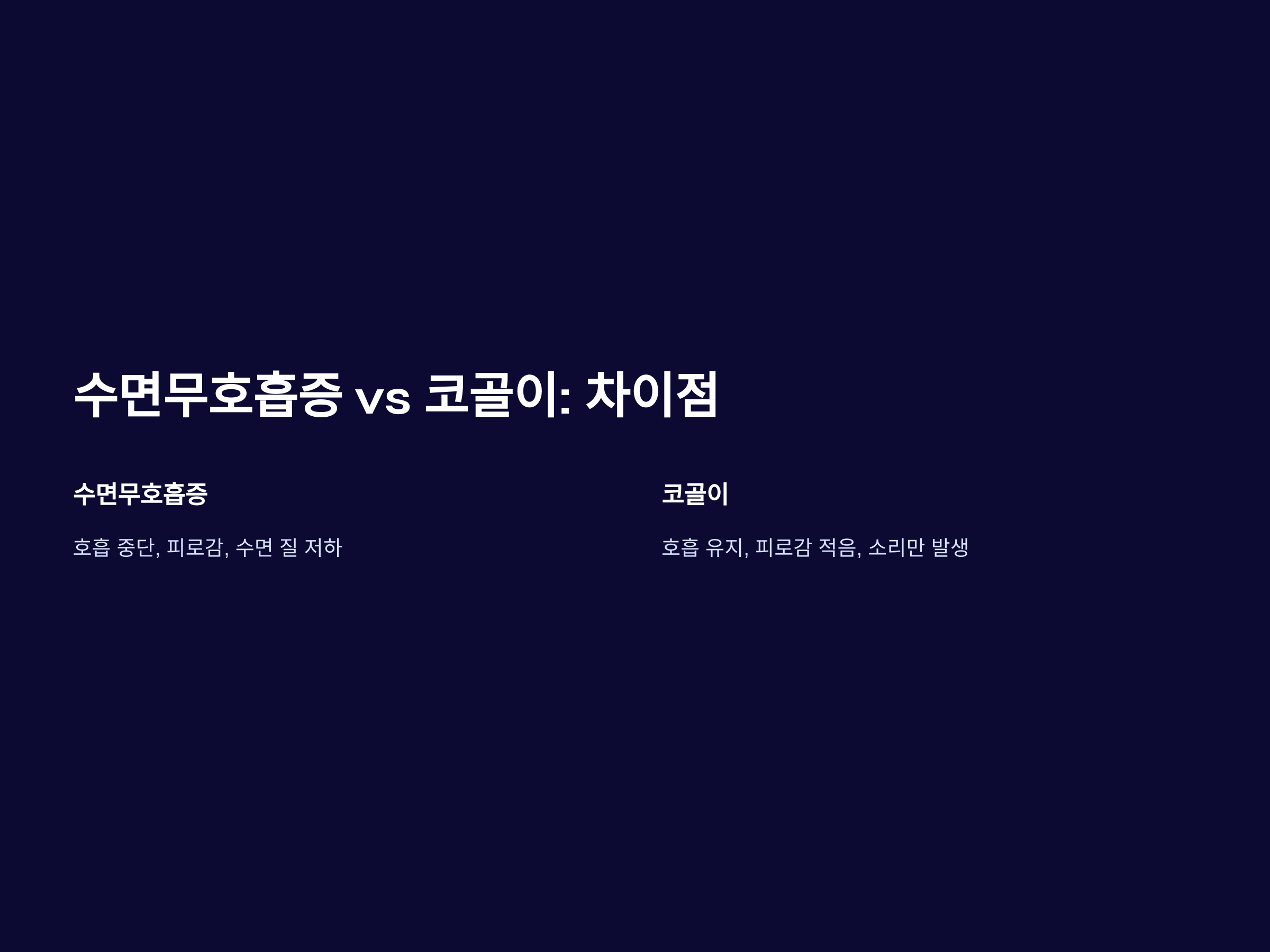 - 코골이: 단순히 숨 쉬는 소리로 발생하며, 호흡은 멈추지 않고, 대부분 아침에 일어날 때 큰 피로감 없이 깨어날 수 있습니다.