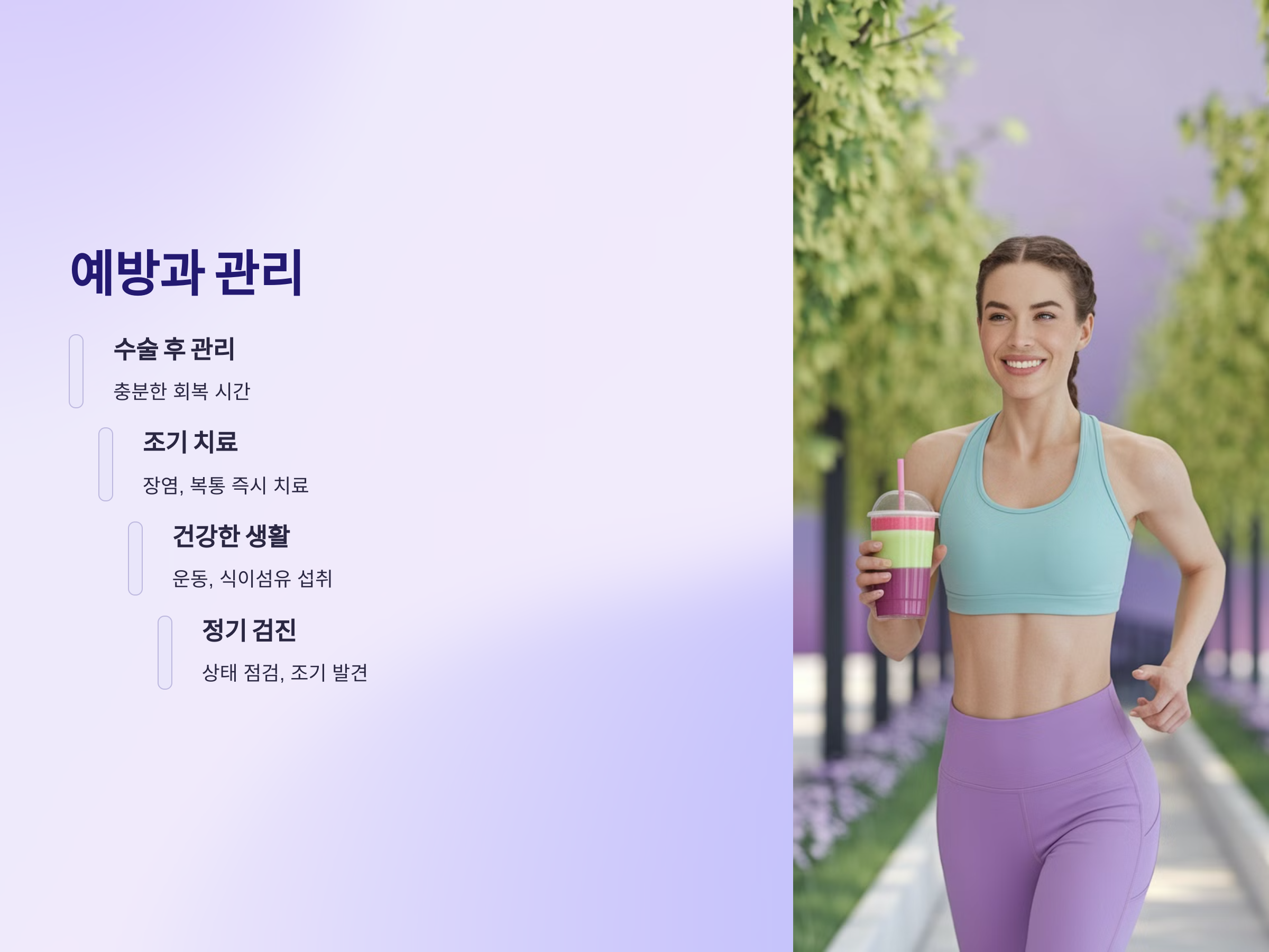 관리 측면에서는 꾸준한 운동과 건강한 식습관이 중요합니다. 특히 장기들이 제대로 움직일 수 있도록 돕는 식이섬유가 풍부한 음식을 섭취하는 것이 좋습니다. 장유착증이 의심되는 경우, 정기적인 검사를 통해 상태를 점검하고, 유착이 심해지기 전에 적절한 치료를 받는 것이 중요합니다.