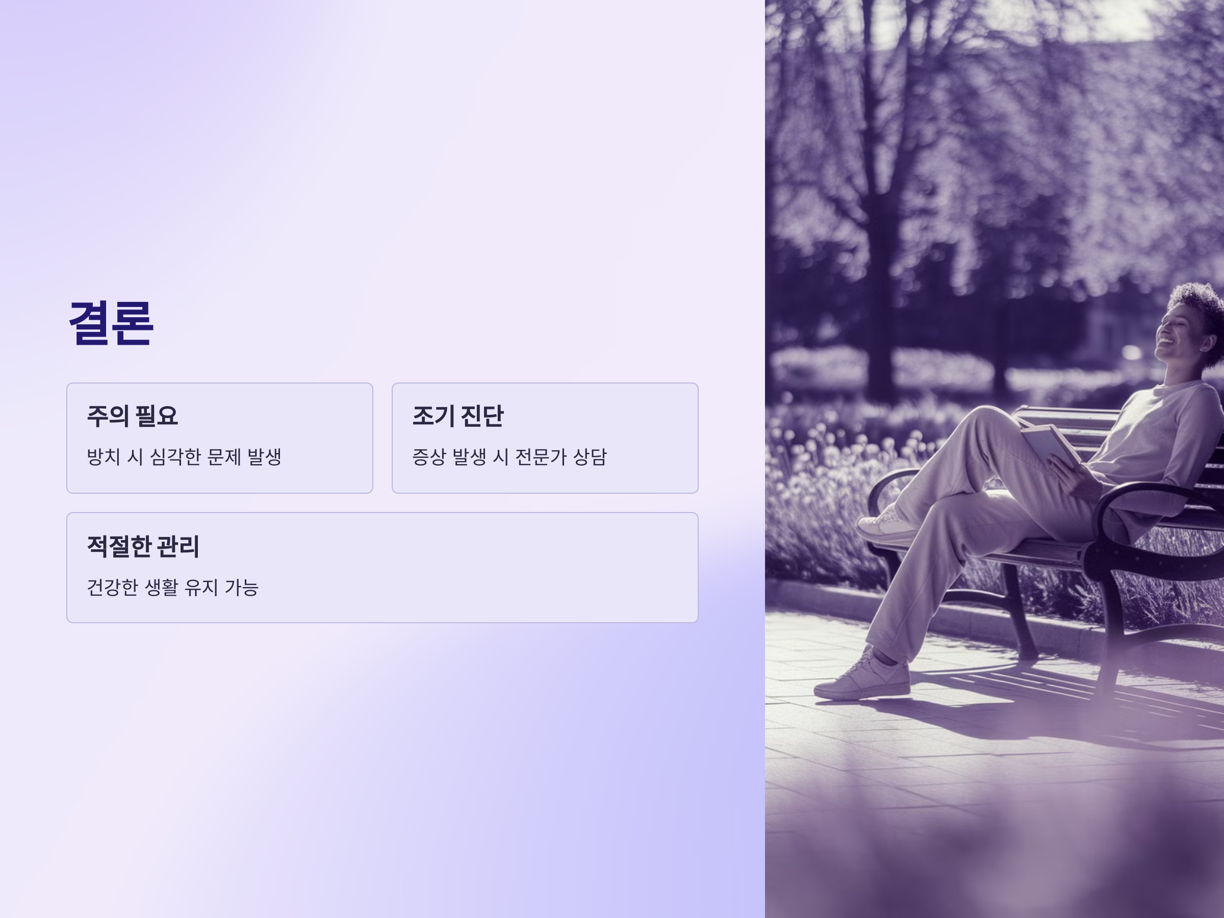 장유착증은 만성 복통과 변비의 주요 원인 중 하나로, 방치하면 심각한 문제로 발전할 수 있습니다. 이를 예방하고 관리하기 위해서는 정확한 진단과 함께 적절한 치료가 필요합니다. 복부 수술을 받은 사람들은 특히 장유착증에 대한 경각심을 가지고, 증상이 나타나면 바로 전문가의 도움을 받는 것이 중요합니다. 장유착증을 잘 관리하고 예방하면, 만성 복통과 변비의 고통에서 벗어날 수 있습니다.