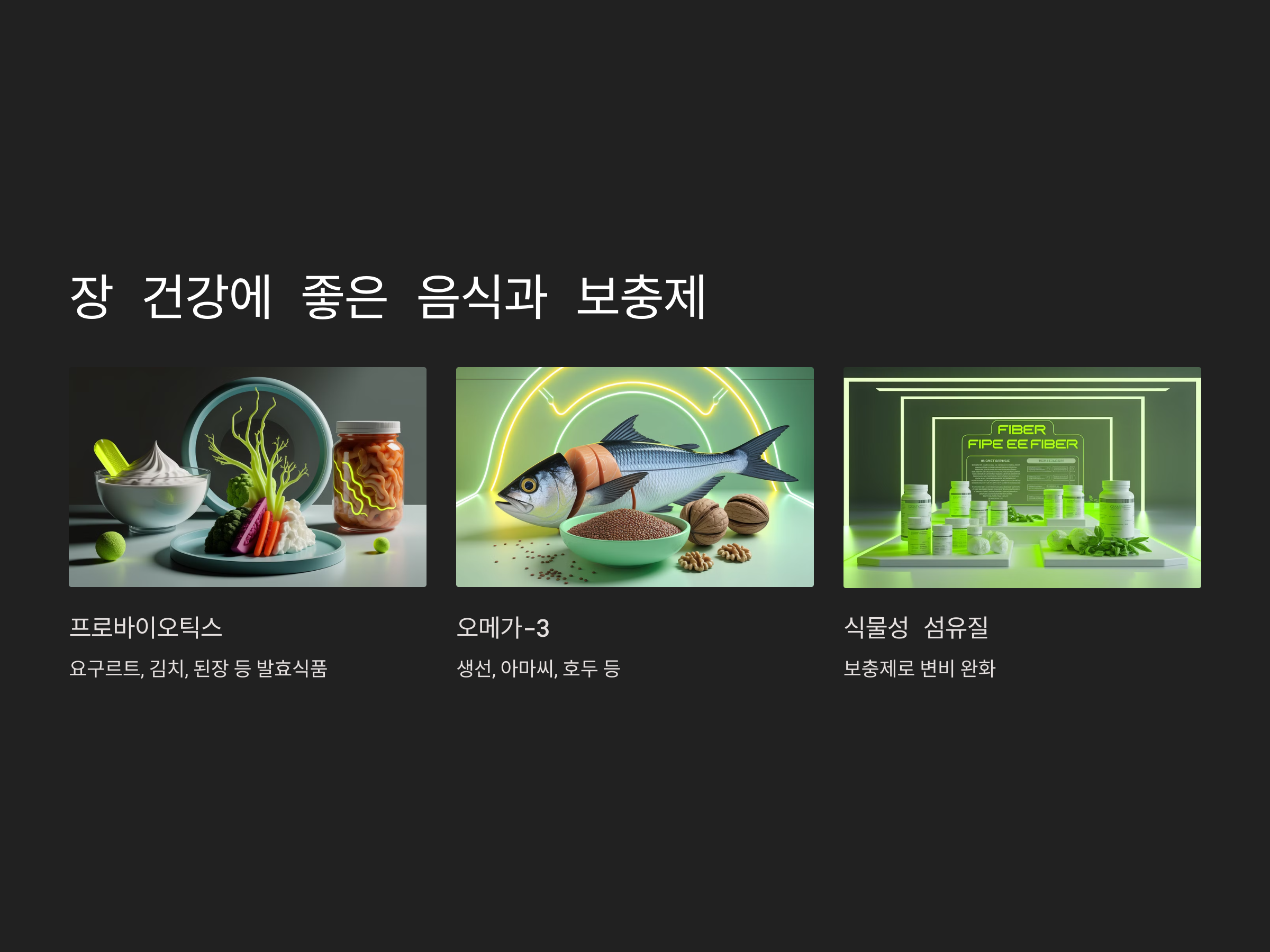 오메가-3 지방산은 염증을 감소시키고 장의 건강을 유지하는 데 중요한 역할을 합니다. 오메가-3는 주로 생선, 아마씨, 호두 등에서 섭취할 수 있으며, 장의 연동 운동을 돕고 복통을 완화하는 데 도움이 됩니다.