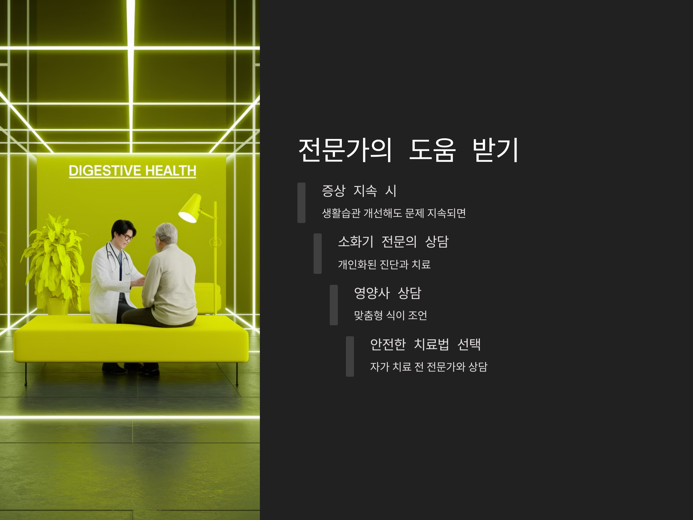 생활 습관을 개선하고 다양한 방법을 실천했음에도 불구하고 여전히 변비와 복통이 지속된다면, 전문가의 도움을 받는 것이 좋습니다. 소화기 전문의나 영양사는 보다 개인화된 조언을 제공하며, 필요한 경우 약물 치료나 추가적인 진단을 통해 문제를 해결할 수 있습니다. 또한, 자가 치료를 시도하기 전에는 반드시 전문가와 상담하여 안전한 방법을 선택하는 것이 중요합니다.