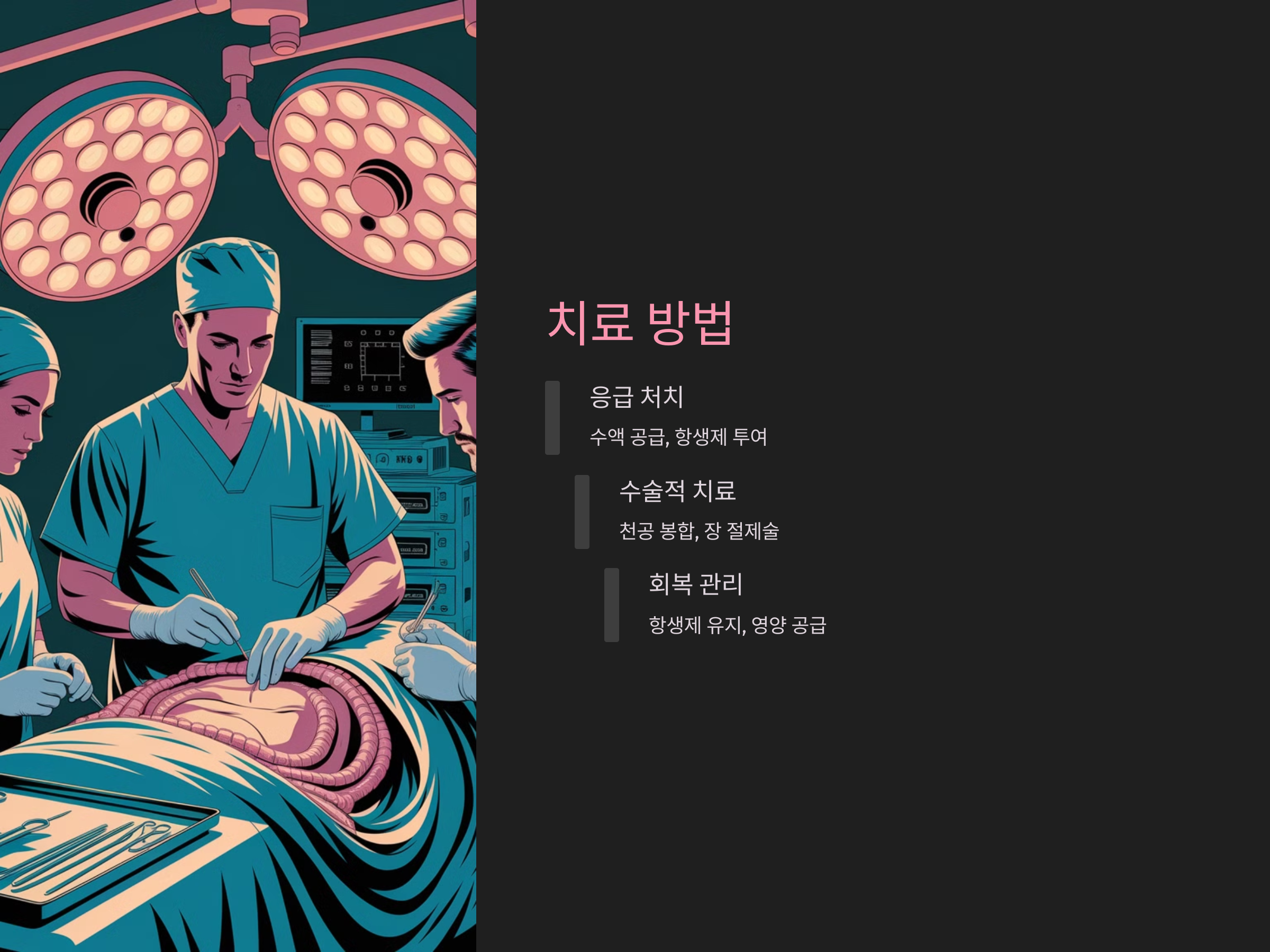 패혈증의 예방과 치료는 빠른 대처가 중요합니다. 장 천공이 의심될 때 즉시 응급처치가 이루어져야 하며, 패혈증 발생을 예방하기 위한 항생제 치료와 외과적 치료가 필요할 수 있습니다. 장 천공으로 인한 패혈증은 환자의 상태에 따라 매우 빠르게 악화될 수 있기 때문에, 적절한 시점에 진단하고 치료하는 것이 가장 중요합니다.