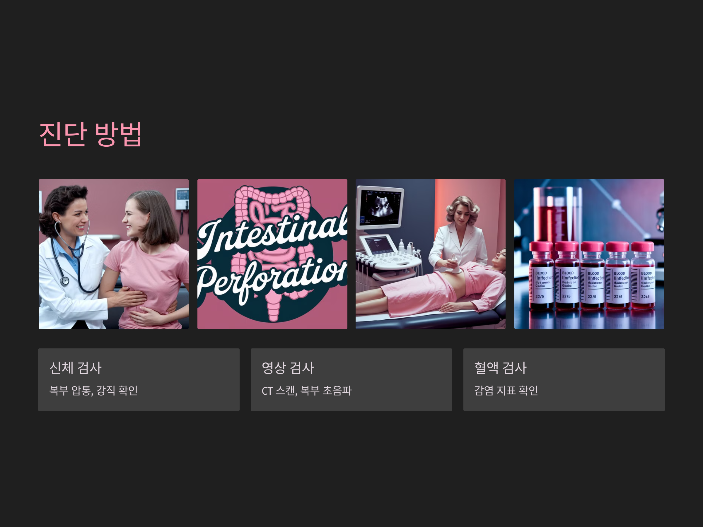 복통 외에도 환자는 발열, 구토, 구역질, 복부 팽만 등의 증상을 경험할 수 있습니다. 이 증상들은 장 천공이 발생하고 그로 인해 복강 내 염증과 감염이 퍼지는 과정에서 발생하는 전형적인 증상입니다. 장 천공이 의심될 경우, 즉시 응급 치료를 받아야 하며, 진단을 위해 CT 스캔이나 복부 초음파 검사가 필요할 수 있습니다.