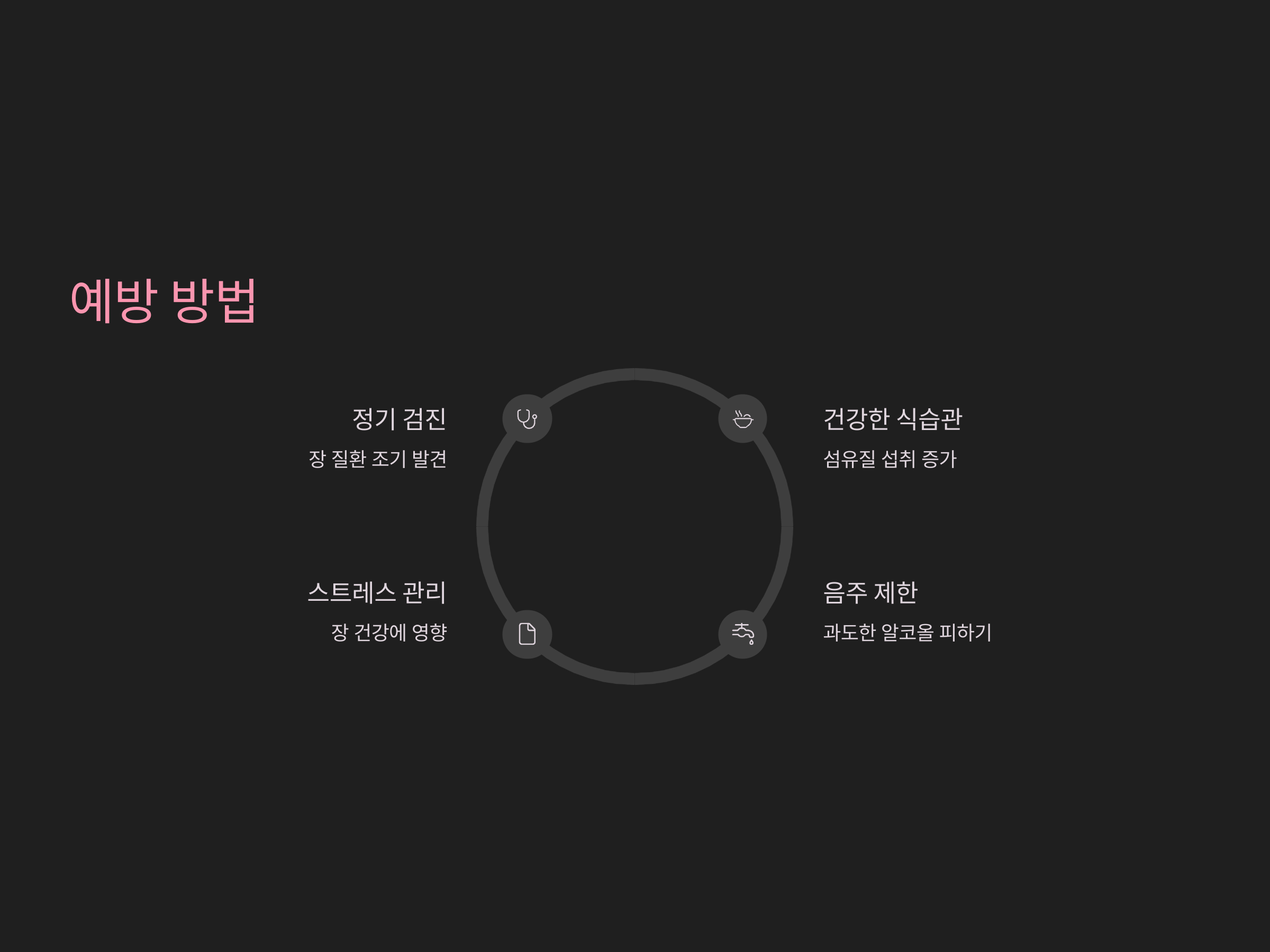 장 천공을 예방하기 위해서는 장 건강을 관리하는 것이 중요합니다. 염증성 장 질환이 있는 환자는 정기적으로 병원에 방문하여 치료를 받고, 과도한 음주나 장기적인 스트레스를 피하는 것이 좋습니다. 또한, 복부에 외상이 발생하지 않도록 주의하고, 안전한 생활 습관을 유지하는 것이 중요합니다.