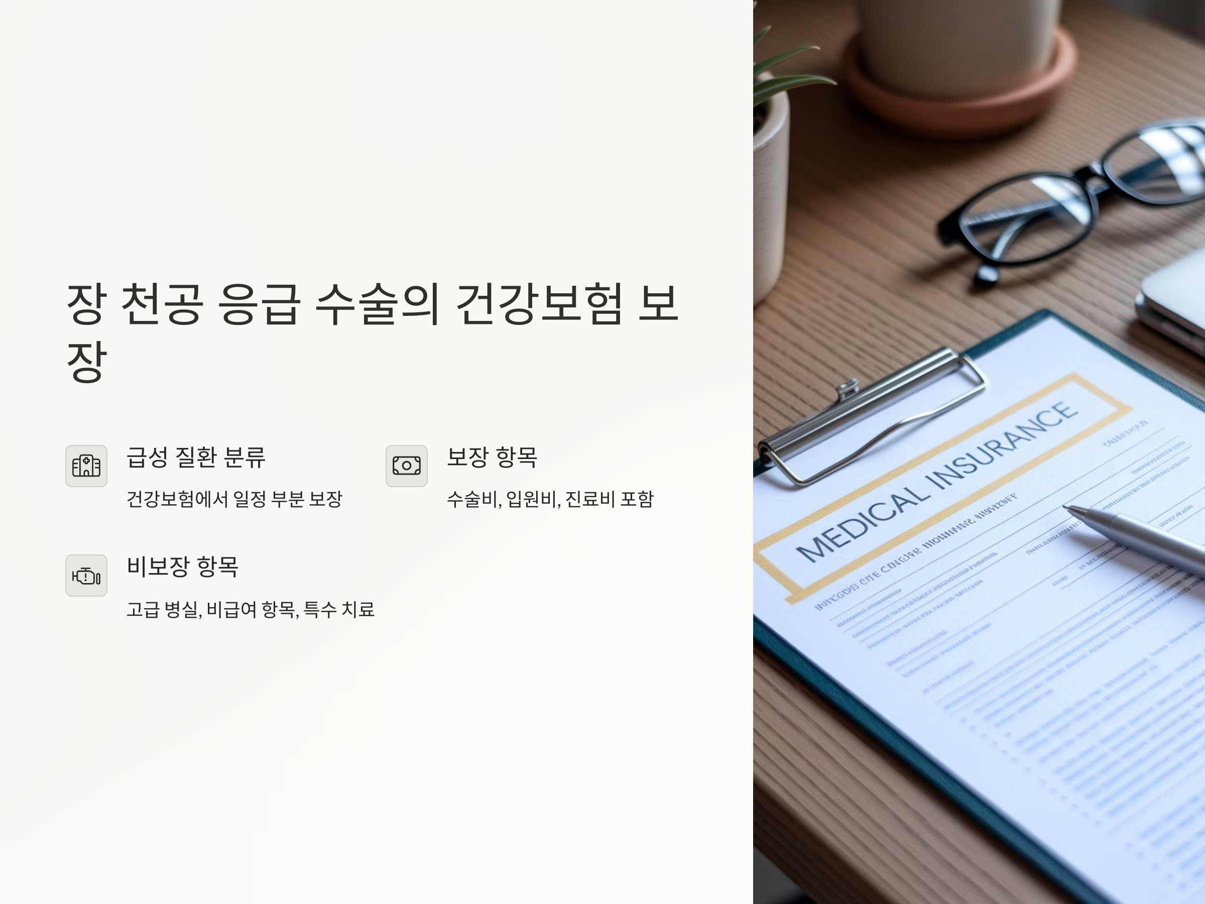 장 천공 응급 수술에 대한 건강보험의 보장 범위는 수술비, 입원비, 진료비 등을 포함하여, 환자가 부담해야 하는 비용을 줄여줍니다. 그러나 건강보험이 보장하는 항목에 대한 정확한 적용 여부는 병원의 진료과정과 환자의 상태에 따라 달라질 수 있습니다. 예를 들어, 장 천공에 대한 수술이 긴급성을 요할 경우, 별도의 심사를 거쳐 신속하게 치료비를 지원받을 수 있습니다.