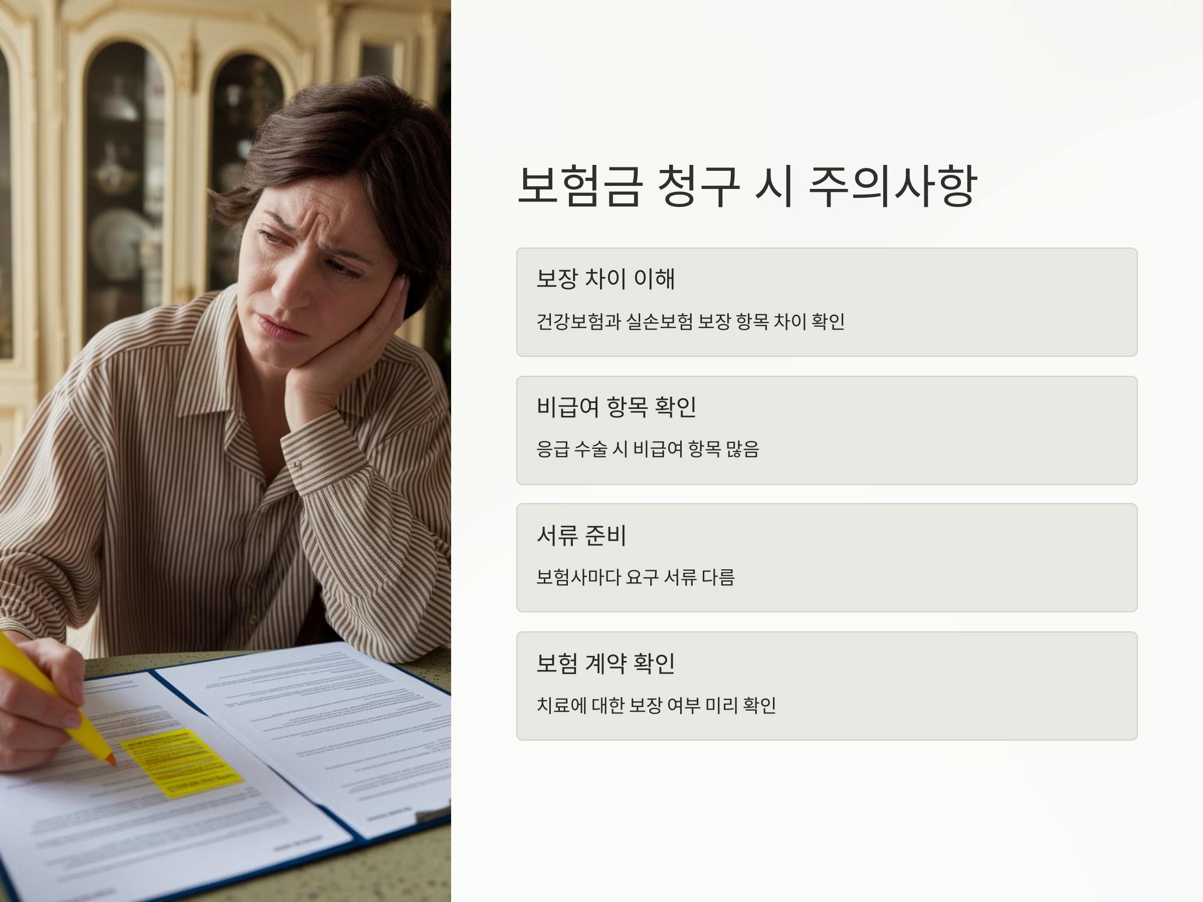 실손보험 청구 절차는 간단하지만, 청구에 필요한 서류가 누락되거나 부정확하면 지급이 지연될 수 있으므로, 서류 준비에 철저히 신경 써야 합니다.
