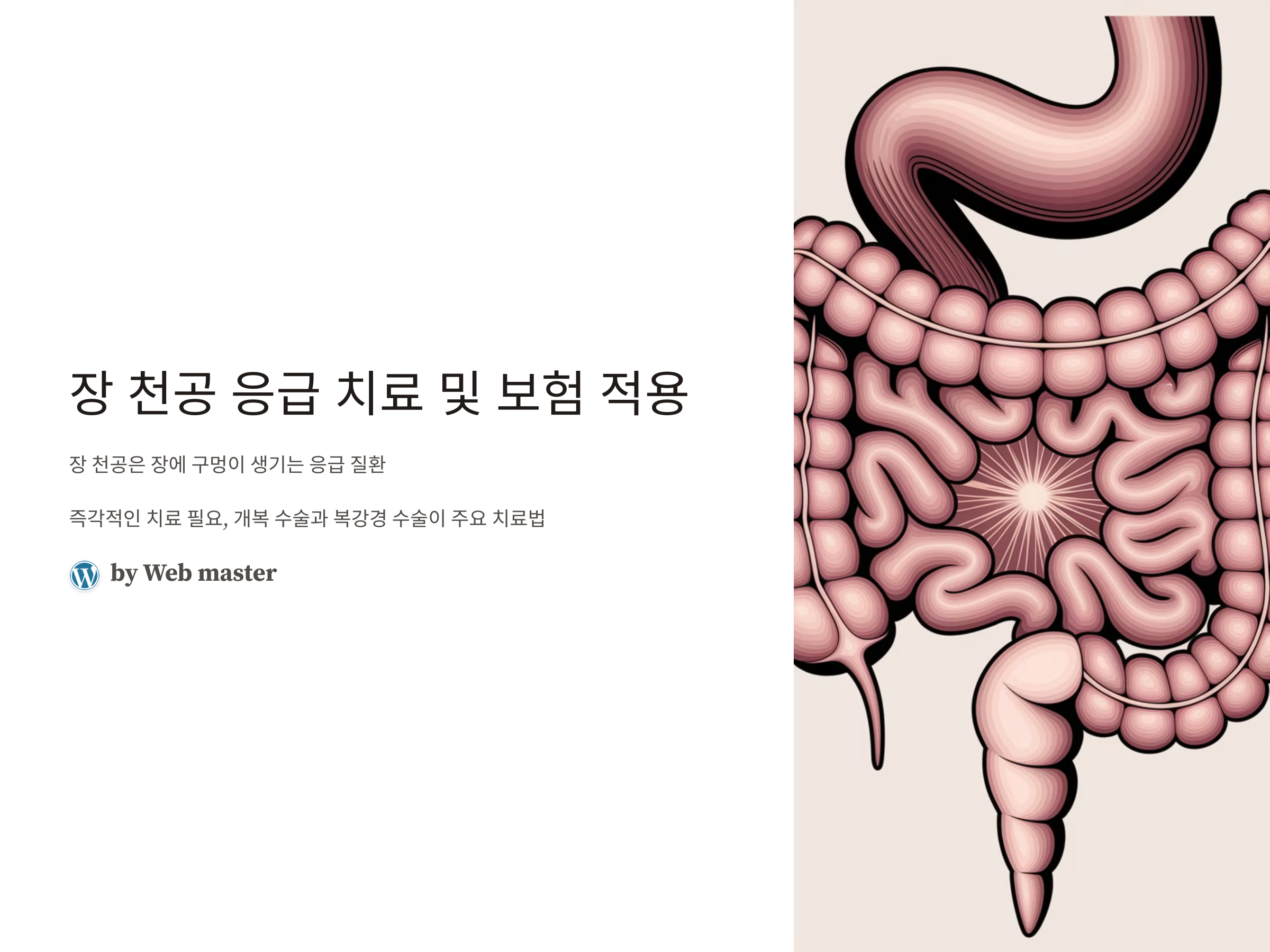장 천공은 장에 구멍이 생기는 상태로, 즉각적인 치료가 필요한 응급 질환입니다. 이 상태에서 치료 방법으로 가장 많이 사용되는 것은 개복 수술과 복강경 수술입니다. 그러나 이러한 수술들이 보험에 어떻게 적용되는지에 대해 많은 사람들이 궁금해하고 있습니다. 장 천공에 대한 치료 방법과 보험 적용 여부를 정확하게 이해하는 것이 중요합니다. 이 글에서는 장 천공 응급 치료를 위한 수술 방법과 이에 대한 보험 적용 여부를 상세히 설명하겠습니다.