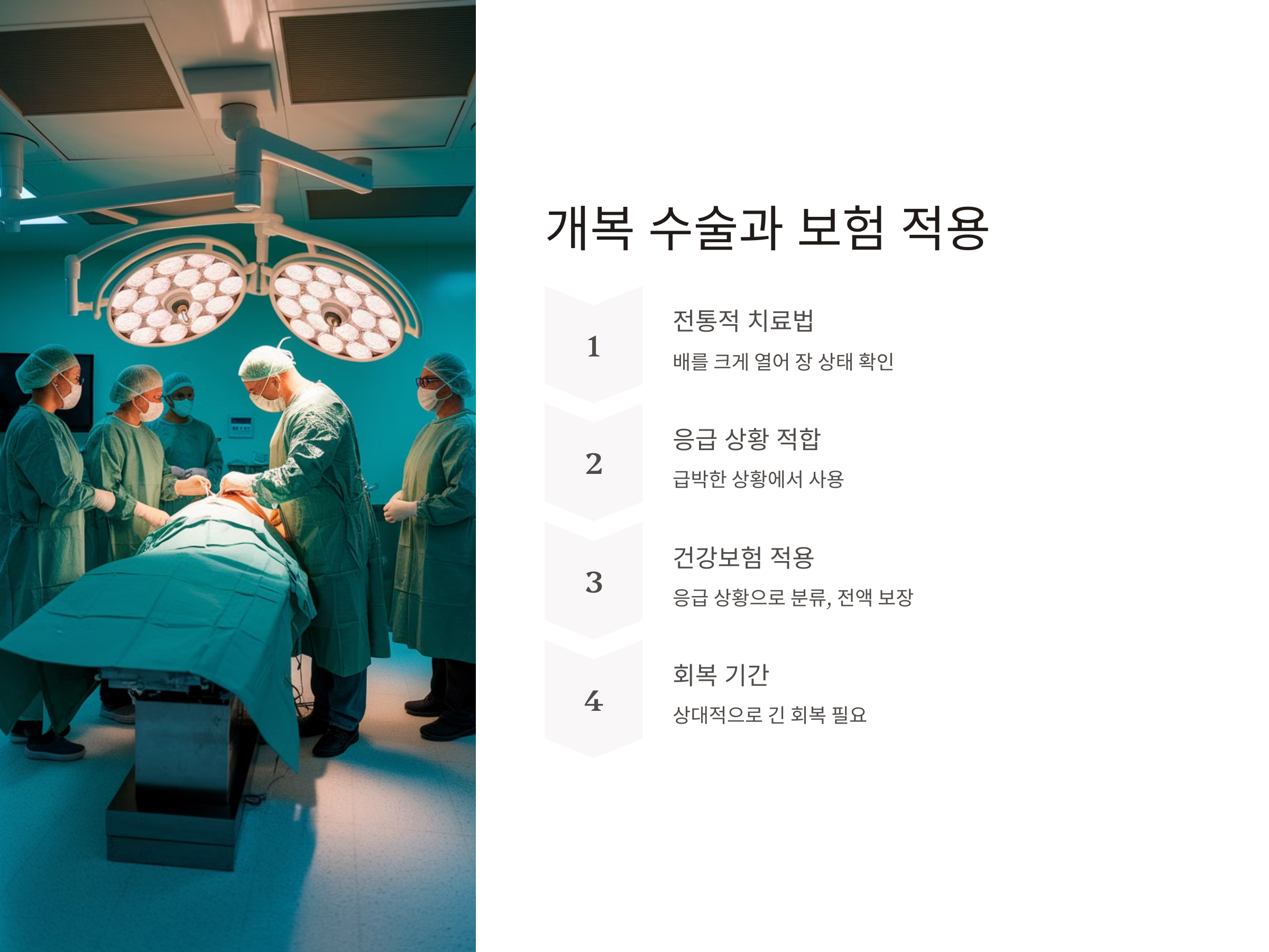 개복 수술은 장 천공의 응급 치료 중 가장 전통적인 방법으로, 배를 크게 열고 장의 상태를 확인한 후 수술을 진행합니다. 이 방법은 상황에 따라 매우 급박하고 긴급한 상황에서 사용될 수 있습니다. 개복 수술은 복잡하고 시간이 오래 걸릴 수 있기 때문에, 수술 후 회복 기간도 길어질 수 있습니다. 하지만 장 천공이 발생한 경우, 빠른 수술이 필요한 상황이므로 보험 적용을 받을 수 있습니다.