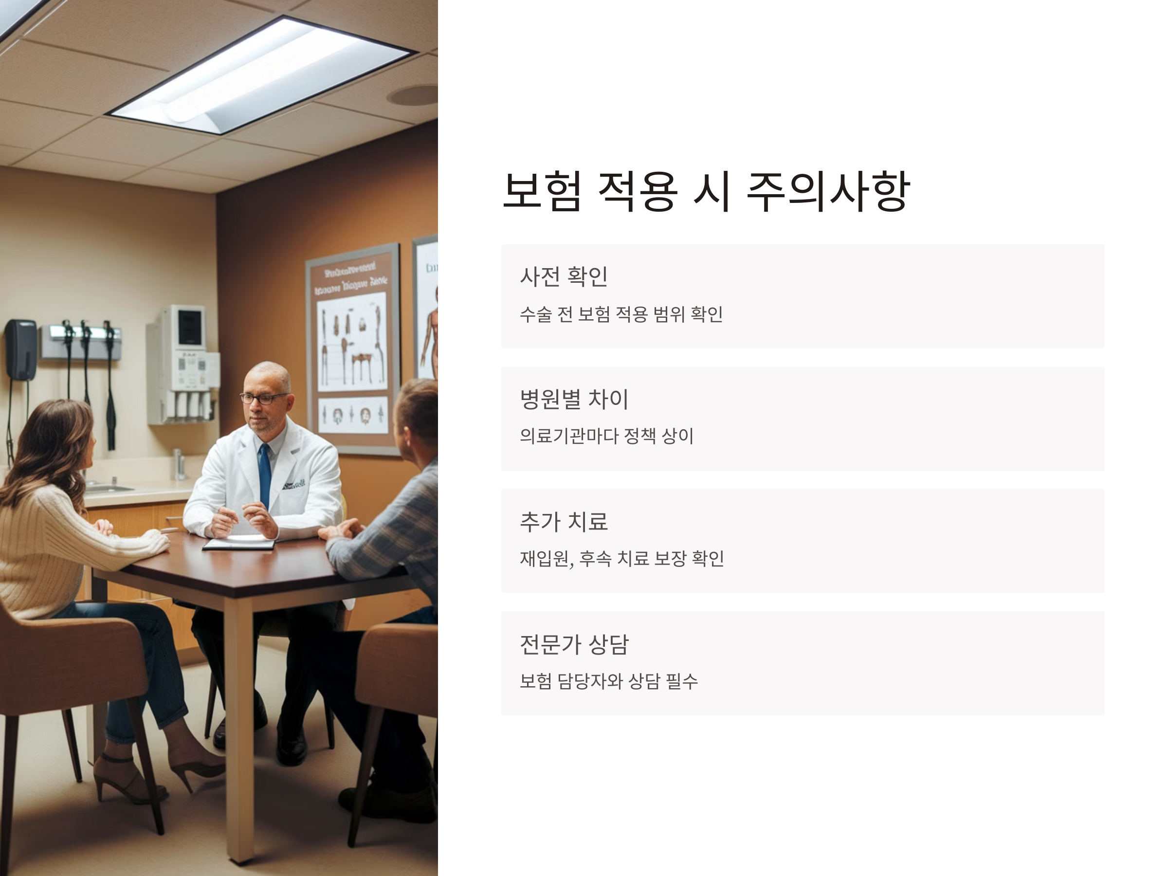 또한, 개인의 보험 가입 상태나 보험 조건에 따라 차이가 있을 수 있기 때문에, 수술 전 보험 설계사나 병원 보험 담당자와 상담을 진행하는 것이 매우 중요합니다. 수술 후 발생할 수 있는 비용에 대해서도 사전 검토를 통해 미리 준비할 수 있습니다.