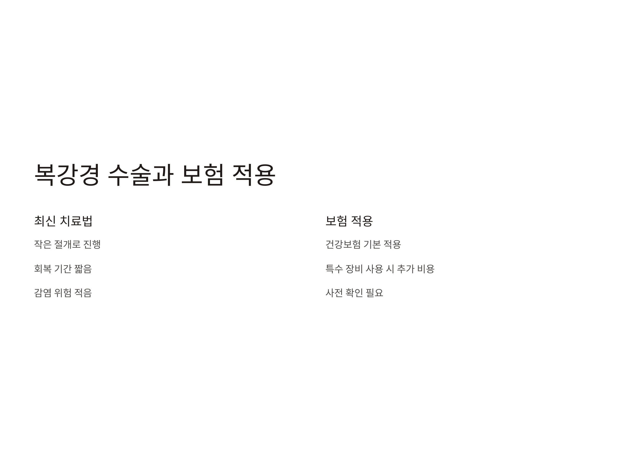 복강경 수술도 기본적으로 건강보험 적용을 받을 수 있습니다. 다만, 병원이나 수술의 난이도, 특수한 장비 사용에 따라 일부 추가 비용이 발생할 수 있습니다. 보통 건강보험은 급여 항목에 해당하는 수술이므로, 기본적인 수술 비용은 전액 건강보험에서 지원되지만, 장비나 병원에 따라 추가 비용이 발생할 수 있으므로 사전에 정확히 확인하는 것이 좋습니다.