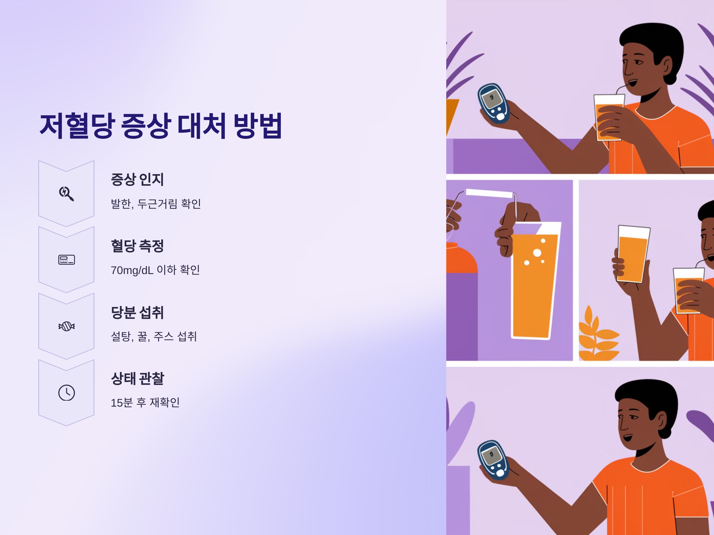 저혈당 증상이 나타날 때 가장 중요한 것은 빠르게 혈당을 올리는 것입니다. 즉시 섭취할 수 있는 고당도 음식을 찾는 것이 중요합니다. 예를 들어, 설탕이나 꿀, 주스 등 당분이 빠르게 흡수되는 음식을 섭취하는 것이 가장 효과적입니다. 만약 당뇨병 환자라면, 혈당을 측정하고 필요에 따라 인슐린을 조절할 수 있어야 합니다.