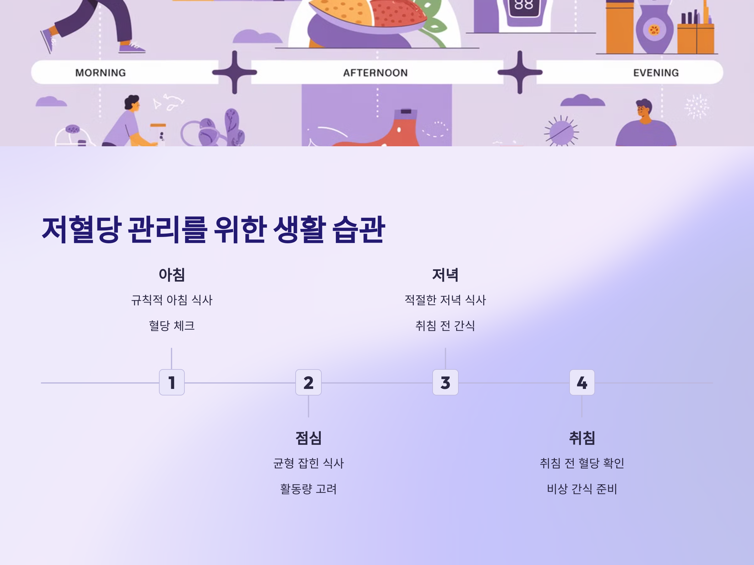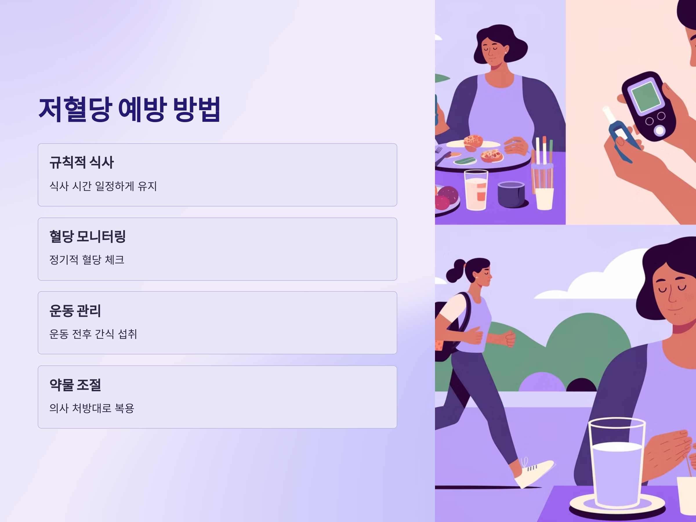 저혈당을 예방하기 위한 가장 중요한 방법은 규칙적인 식사와 혈당 관리입니다. 당뇨병이 있는 경우, 의사의 처방에 따라 인슐린 주사나 약물을 적절히 관리하는 것이 필수적입니다. 또한, 당뇨병 환자는 식사 후 일정 시간에 맞춰 혈당을 측정하여, 혈당이 급격히 떨어지는 일이 없도록 해야 합니다.