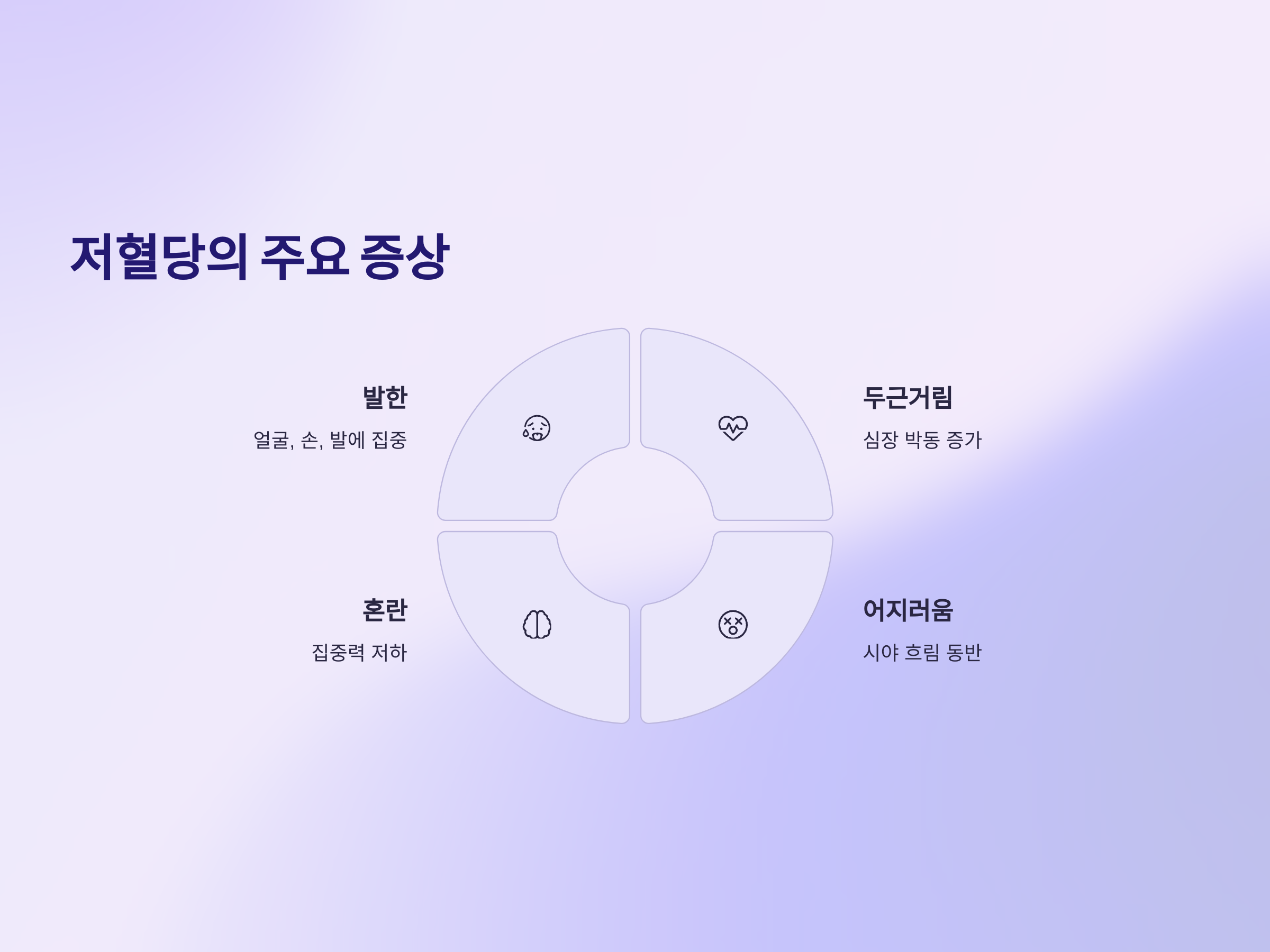 저혈당은 혈당 수치가 70mg/dL 이하로 떨어졌을 때를 말하며, 이는 특히 당뇨병을 관리하는 사람들에게 빈번하게 발생할 수 있습니다. 발한과 두근거림은 혈당이 급격히 떨어질 때 자주 나타나는 증상입니다. 혈당이 낮아지면 우리 몸은 이를 조절하려는 반응을 보이며, 그 중 하나가 교감신경 활성화입니다. 교감신경이 활성화되면 두근거림이나 발한, 불안감 등이 발생할 수 있습니다. 이 증상은 특히 당뇨병 환자에게서 자주 나타나며, 혈당을 조절하지 않으면 더 심각한 합병증을 유발할 수 있습니다.
