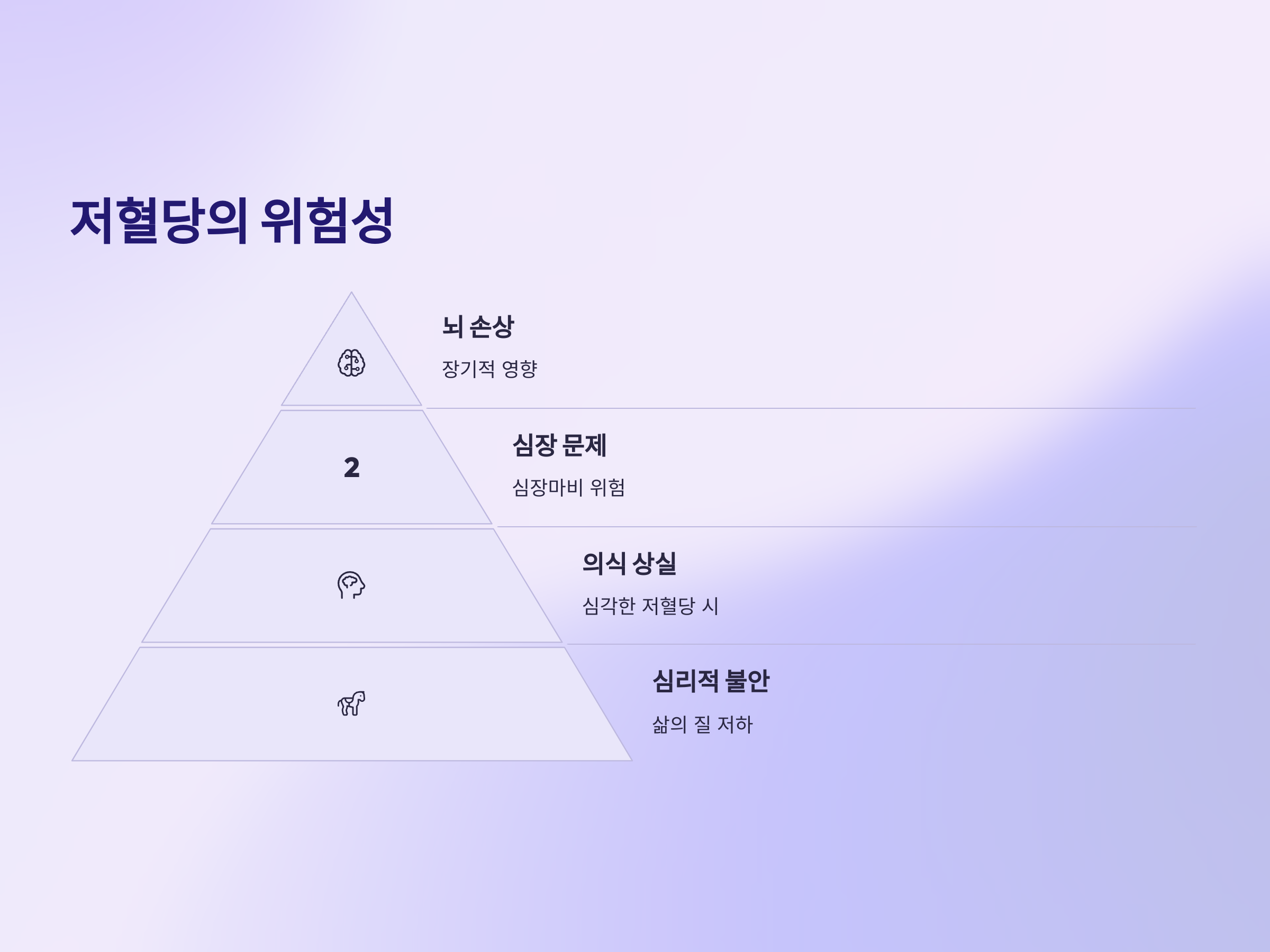 저혈당이 반복되면 신경계에 심각한 영향을 미칠 수 있으며, 장기적으로 뇌에 손상을 줄 수 있습니다. 특히 저혈당이 심각하게 진행되면 의식 상실이나 심장마비, 뇌졸중 등의 합병증을 유발할 수 있습니다. 또한, 저혈당 증상이 반복되면 심리적으로도 불안감과 두려움을 일으킬 수 있으며, 이는 삶의 질에 영향을 미칠 수 있습니다.