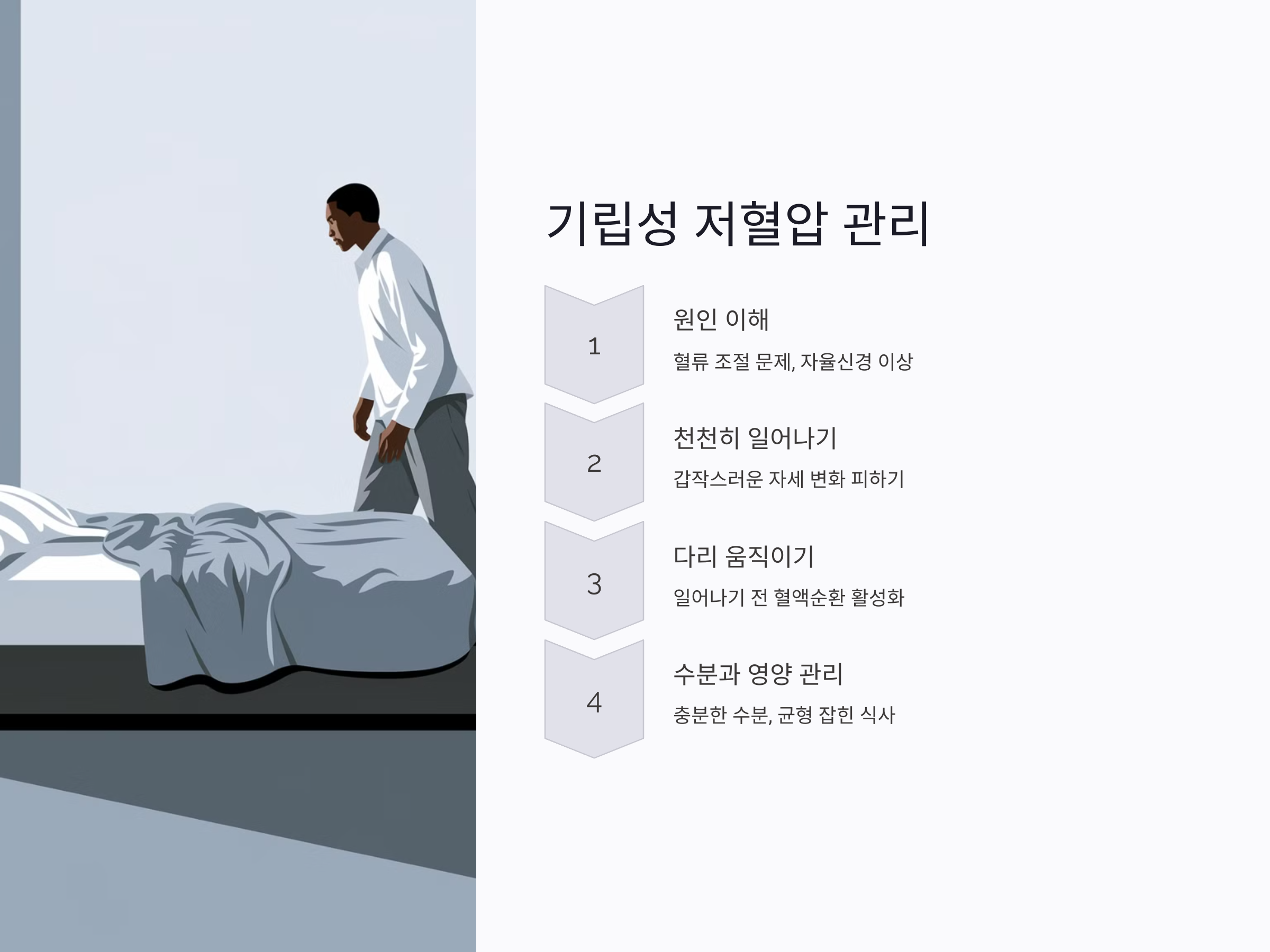 기립성 저혈압은 앉아 있거나 누워 있다가 갑자기 일어설 때 혈압이 급격히 떨어지는 현상입니다.