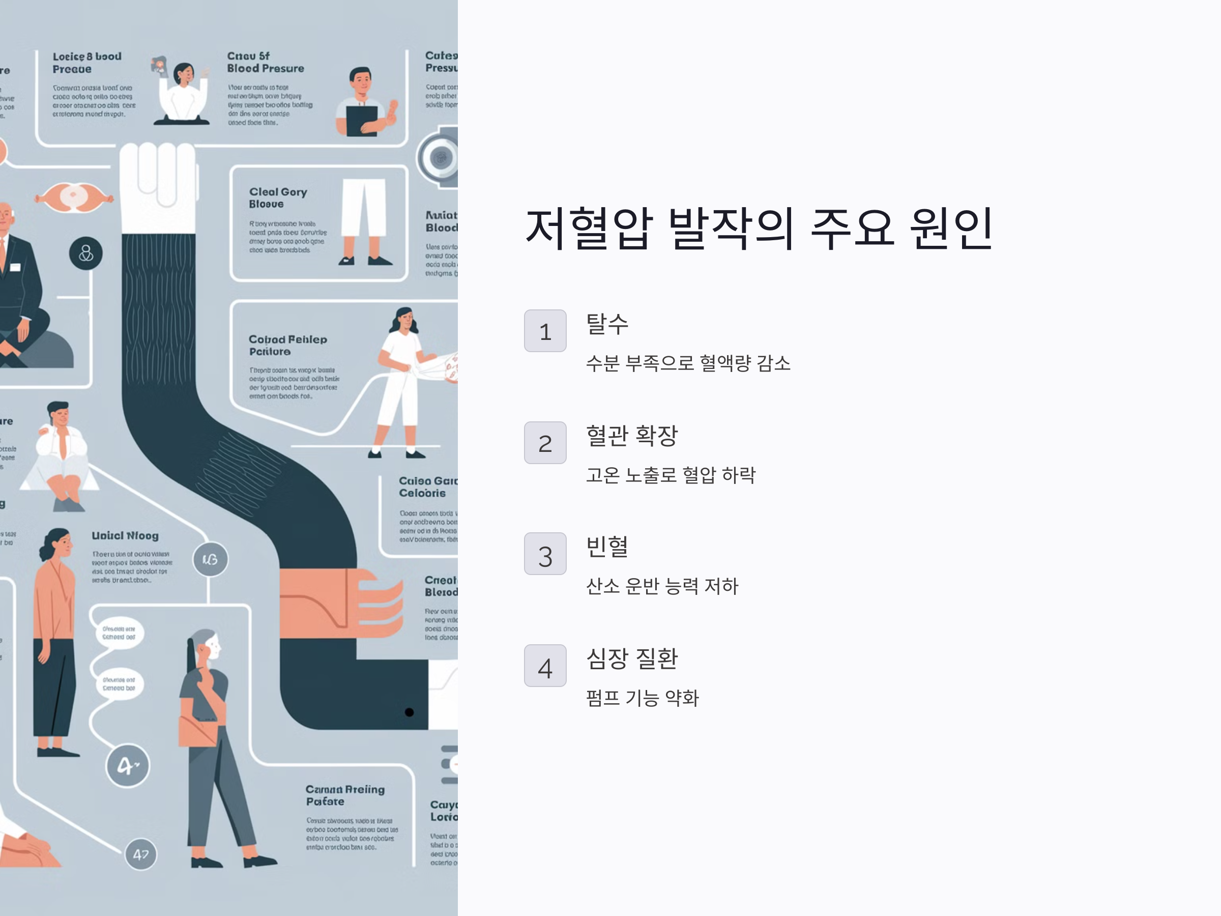 - 탈수: 수분 섭취 부족으로 인해 혈액량이 감소하면 혈압이 급격히 낮아질 수 있습니다.