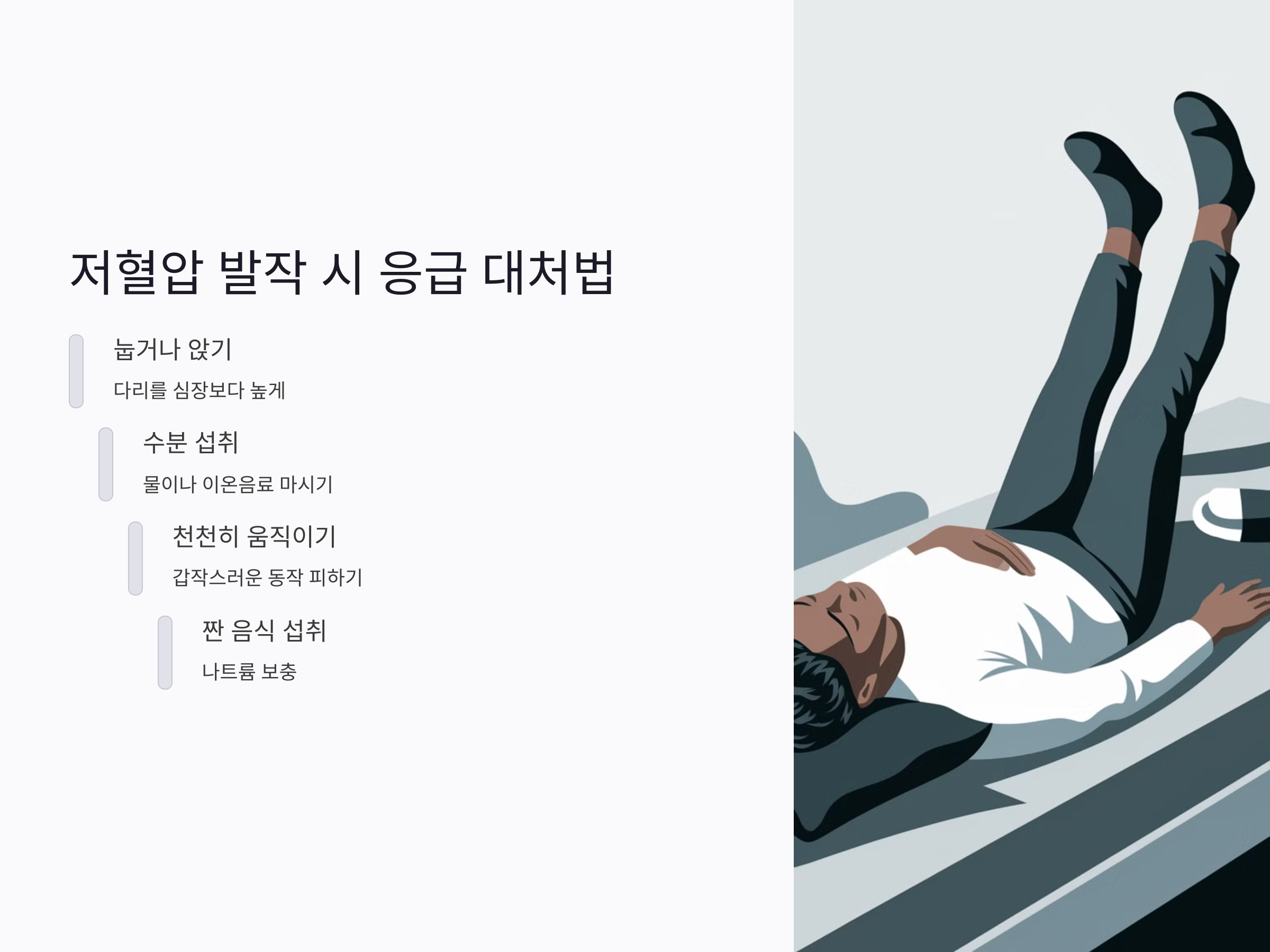 저혈압 발작이 발생했을 때 즉시 취해야 할 조치는 다음과 같습니다.