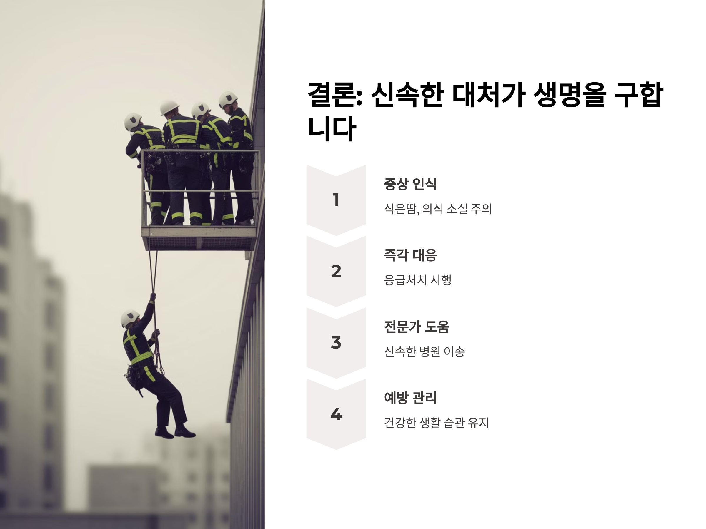 응급처치로는 우선 환자를 안정된 자세로 눕히고 다리를 높게 들어주어 혈액이 뇌로 잘 흐르도록 돕는 것이 중요합니다. 또한, 의식이 없다면 즉시 심폐소생술(CPR)을 시작해야 할 수 있습니다.