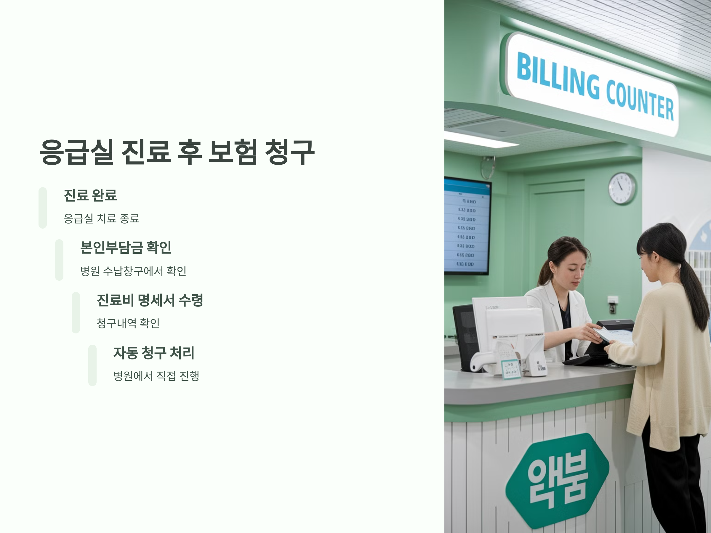 병원에서는 진료비 명세서와 함께 청구 내역을 제공하며, 이를 통해 환자가 직접 건강보험 공단에 청구할 필요는 없습니다. 다만, 만약 보험 적용을 받지 않는 항목이 있다면 환자가 그에 해당하는 비용을 부담하게 됩니다.