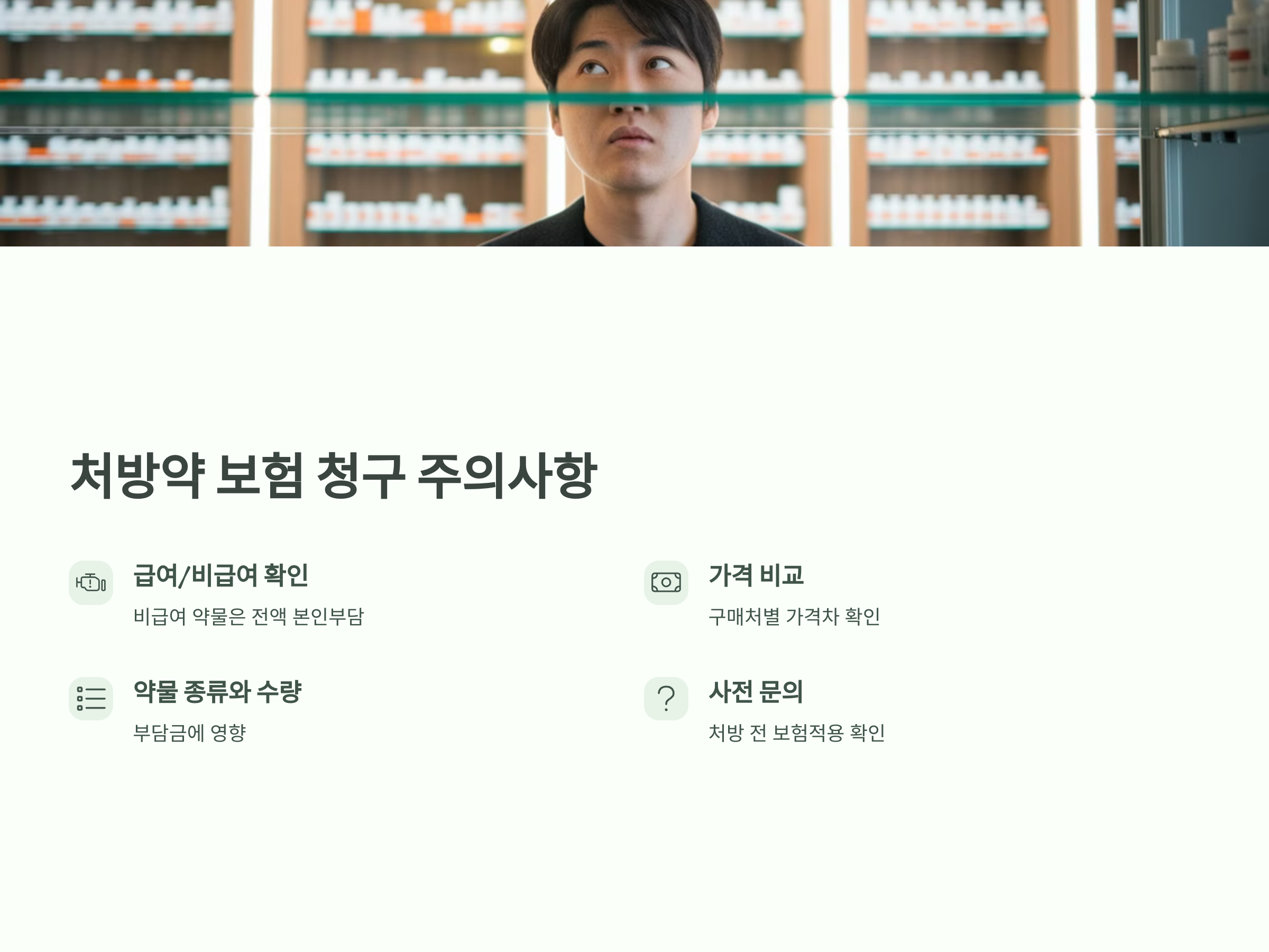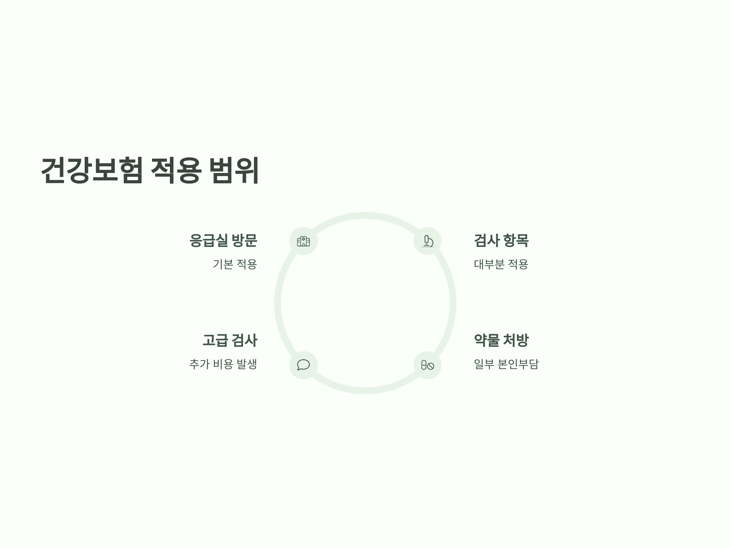 - 약물 처방 또한 건강보험이 적용되며, 일부 약물은 별도의 기준에 따라 본인 부담금이 발생할 수 있습니다.