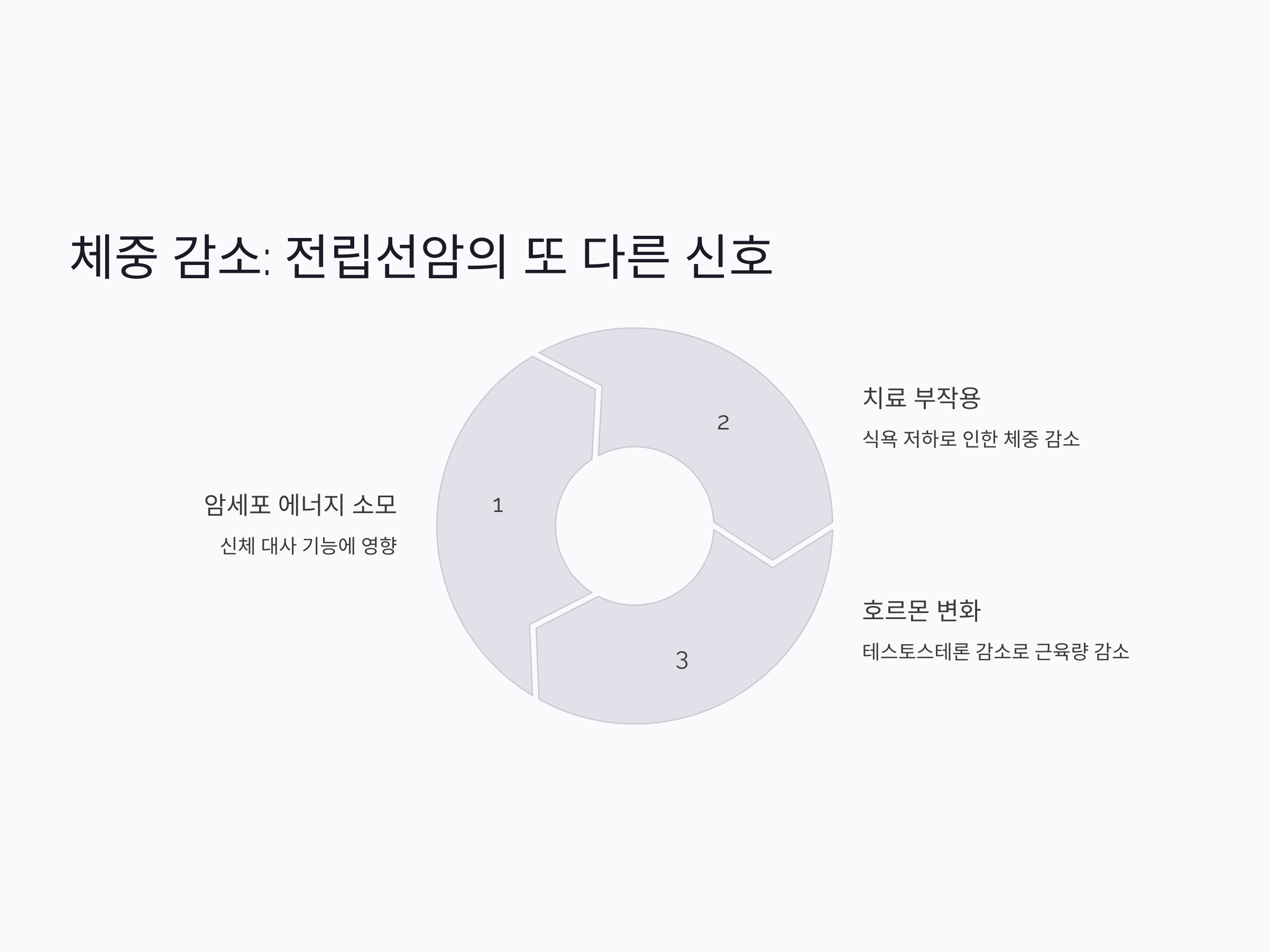 전립선암 환자에서 체중 감소가 나타나는 주요 원인은 여러 가지가 있습니다. 첫 번째로, 암세포가 신체의 에너지를 과도하게 소모하면서 체중이 감소합니다. 두 번째로, 전립선암 치료 과정에서 나타나는 부작용도 영향을 미칠 수 있습니다. 예를 들어, 항암치료나 방사선 치료는 환자의 식욕을 저하시킬 수 있으며, 이에 따라 체중 감소가 일어날 수 있습니다.